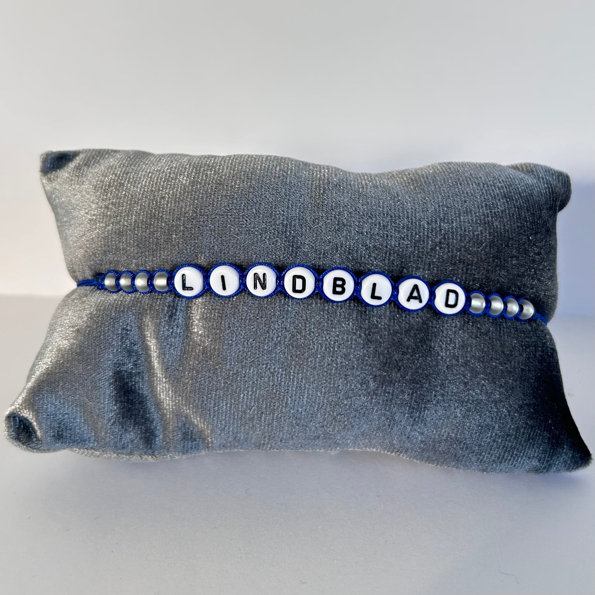 The Lindblad Bracelet is a bracelet with royal blue cord, white glass beads and white with white letters/numbers. The bracelet is adjustable and easy to put on by yourself.