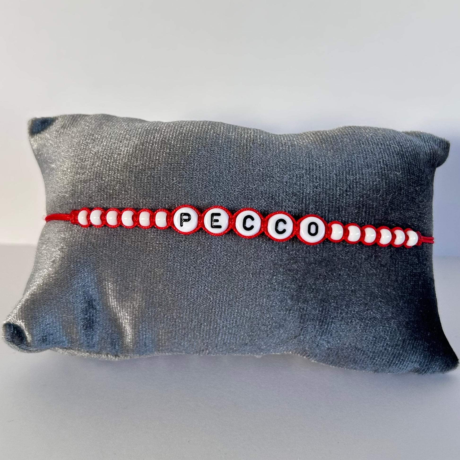 The Pecco Bracelet is a bracelet with red cord, whitw beads and white with black letters/numbers. The bracelet is adjustable and easy to put on by yourself.