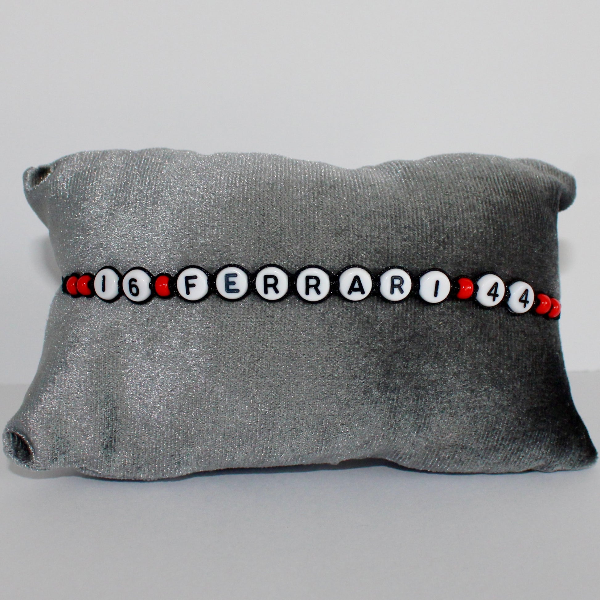 The 16 Ferrari 44 bracelet is a bracelet with black cord, red beads and white with black letters/numbers. The bracelet is adjustable and easy to put on by yourself.