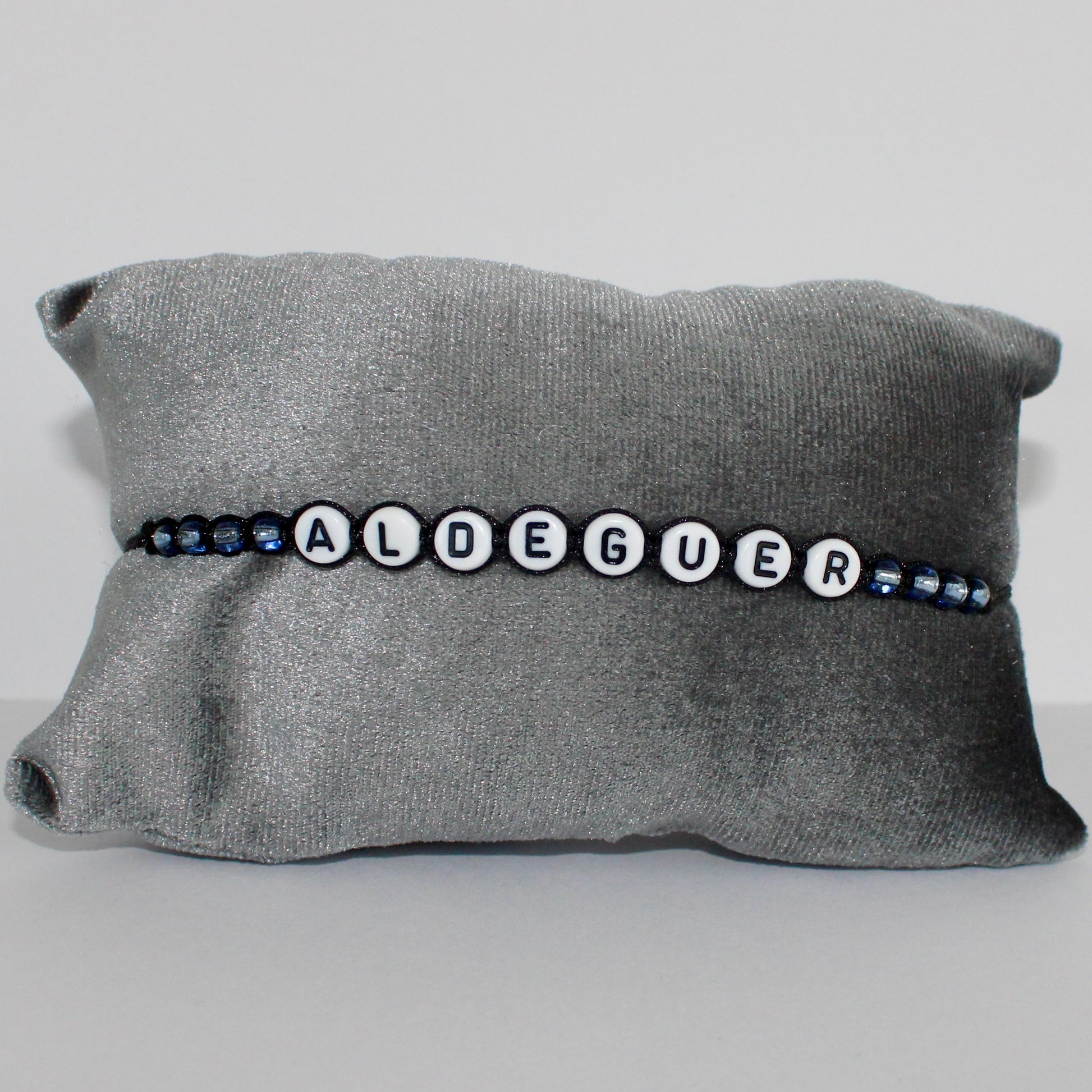 The Aldeguer Bracelet is a bracelet with black cord, blue grey glass beads and white with black letters/numbers. The bracelet is adjustable and easy to put on by yourself.