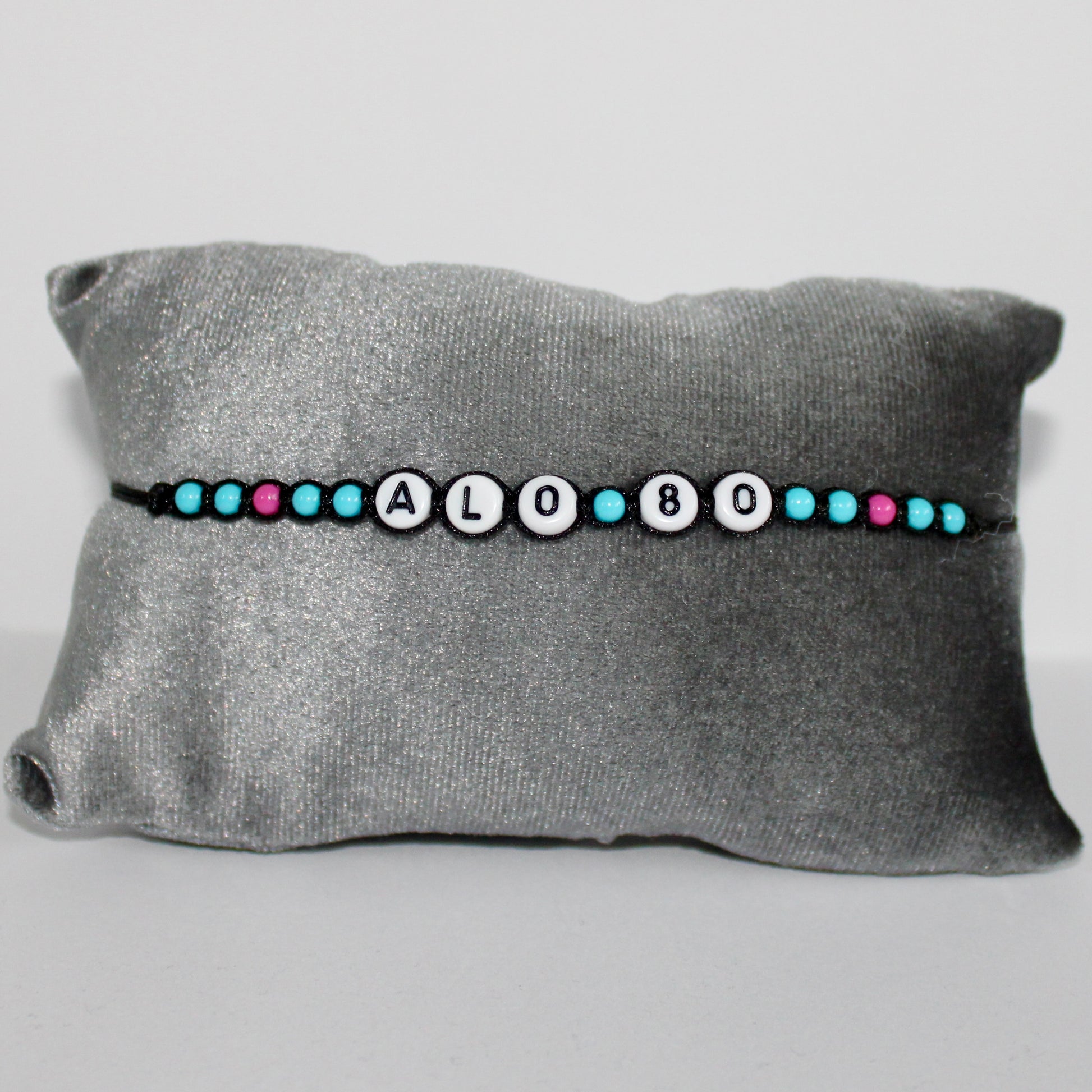 The Alo 80 Bracelet is a bracelet with black cord, light blue and pink beads and white with black letters/numbers. The bracelet is adjustable and easy to put on by yourself.