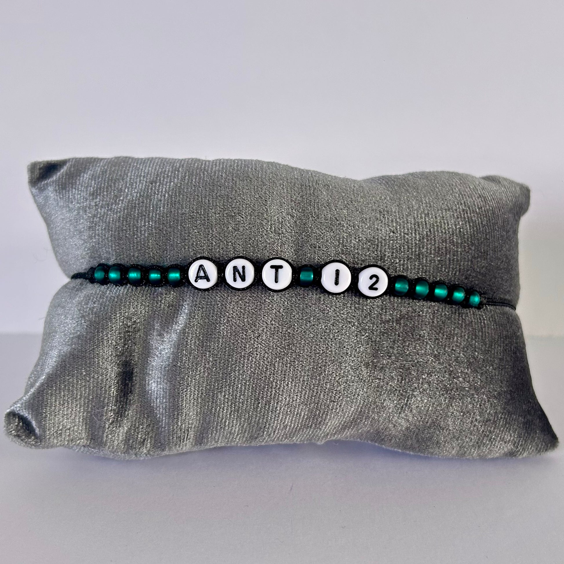 The Ant 12 Bracelet is a bracelet with black cord, glass matt turquoise beads with silver inner lining and white with black letters/numbers. The bracelet is adjustable and easy to put on by yourself.