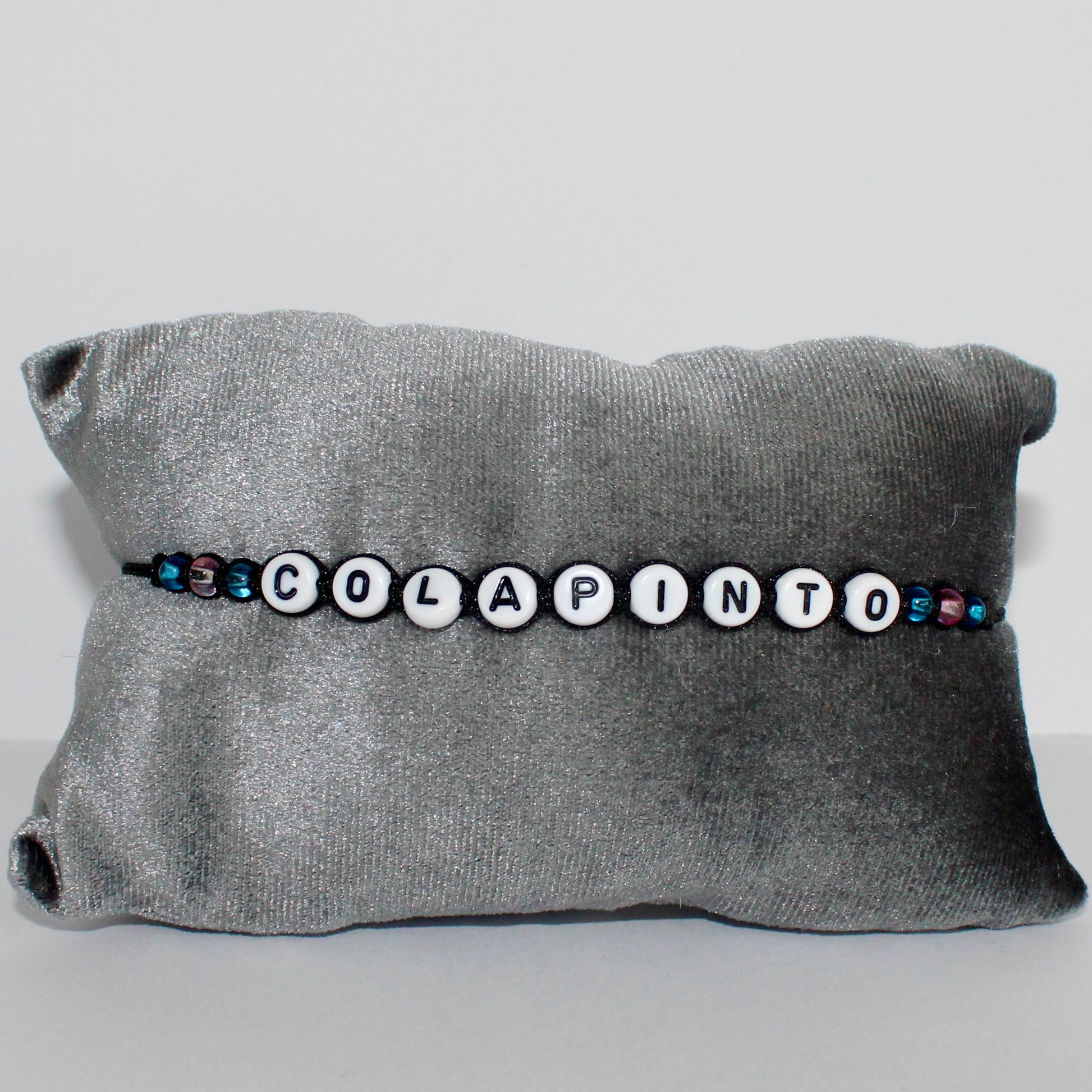 The Colapinto Bracelet is a bracelet with black cord, blue and pink glass beads and white with black letters/numbers. The bracelet is adjustable and easy to put on by yourself.