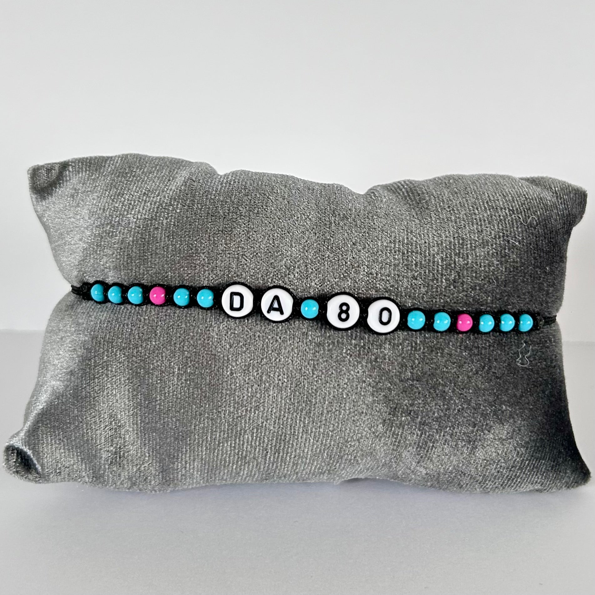 The David Alonso 80 Bracelet is a bracelet with black cord, light blue and pink beads and white with black letters/numbers. The bracelet is adjustable and easy to put on by yourself.