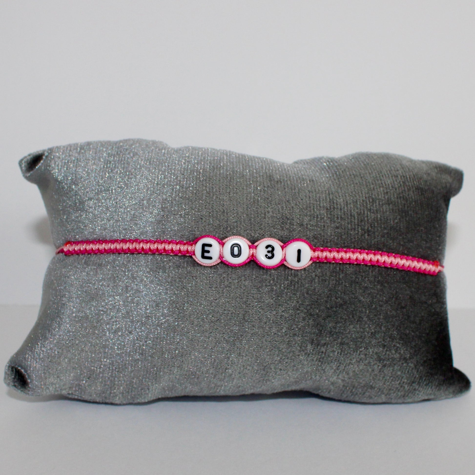 The Esteban Ocon 31 Bracelet is a bracelet with dark and light pink cord and white with black letters/numbers. The bracelet is adjustable and easy to put on by yourself.