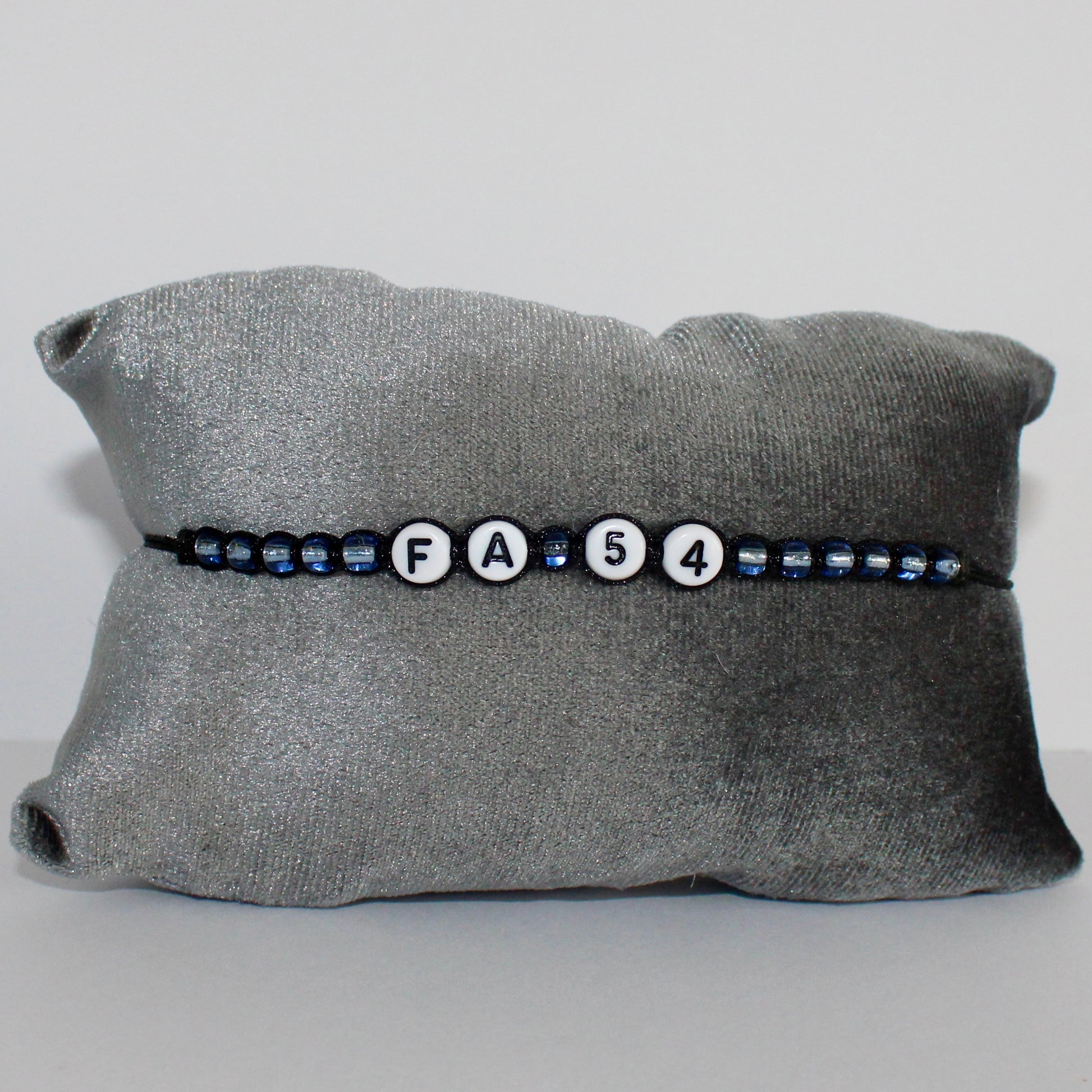 The Fermin Aldeguer 54 Bracelet is a bracelet with black cord, blue grey glass beads and white with black letters/numbers. The bracelet is adjustable and easy to put on by yourself.
