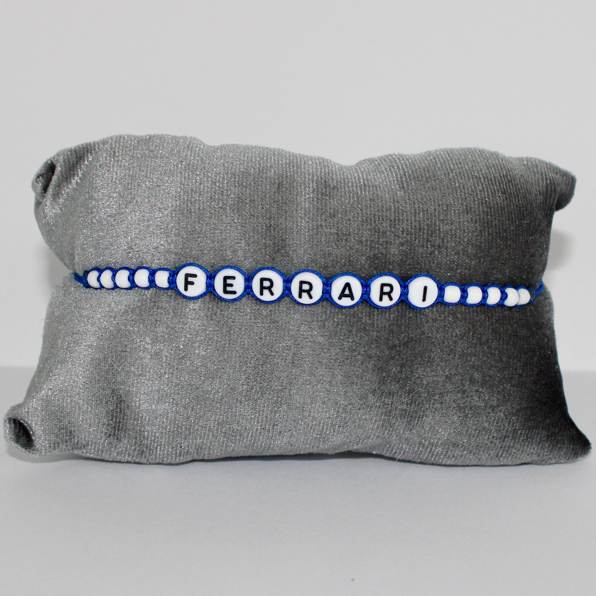 The Ferrari Miami Bracelet is a bracelet with royal blue cord, white beads and white with black letters/numbers. The bracelet is adjustable and easy to put on by yourself.