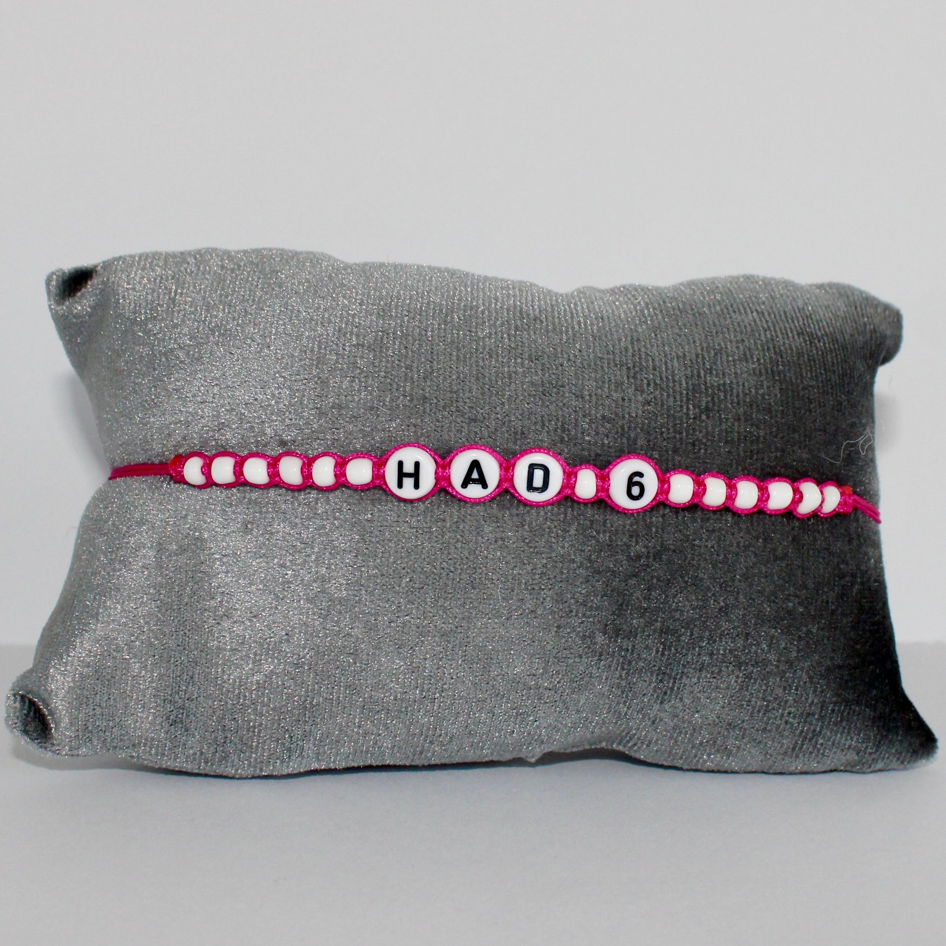 The Had 6 Bracelet is a bracelet with dark pink cord, white beads and white with black letters/numbers. The bracelet is adjustable and easy to put on yourself.