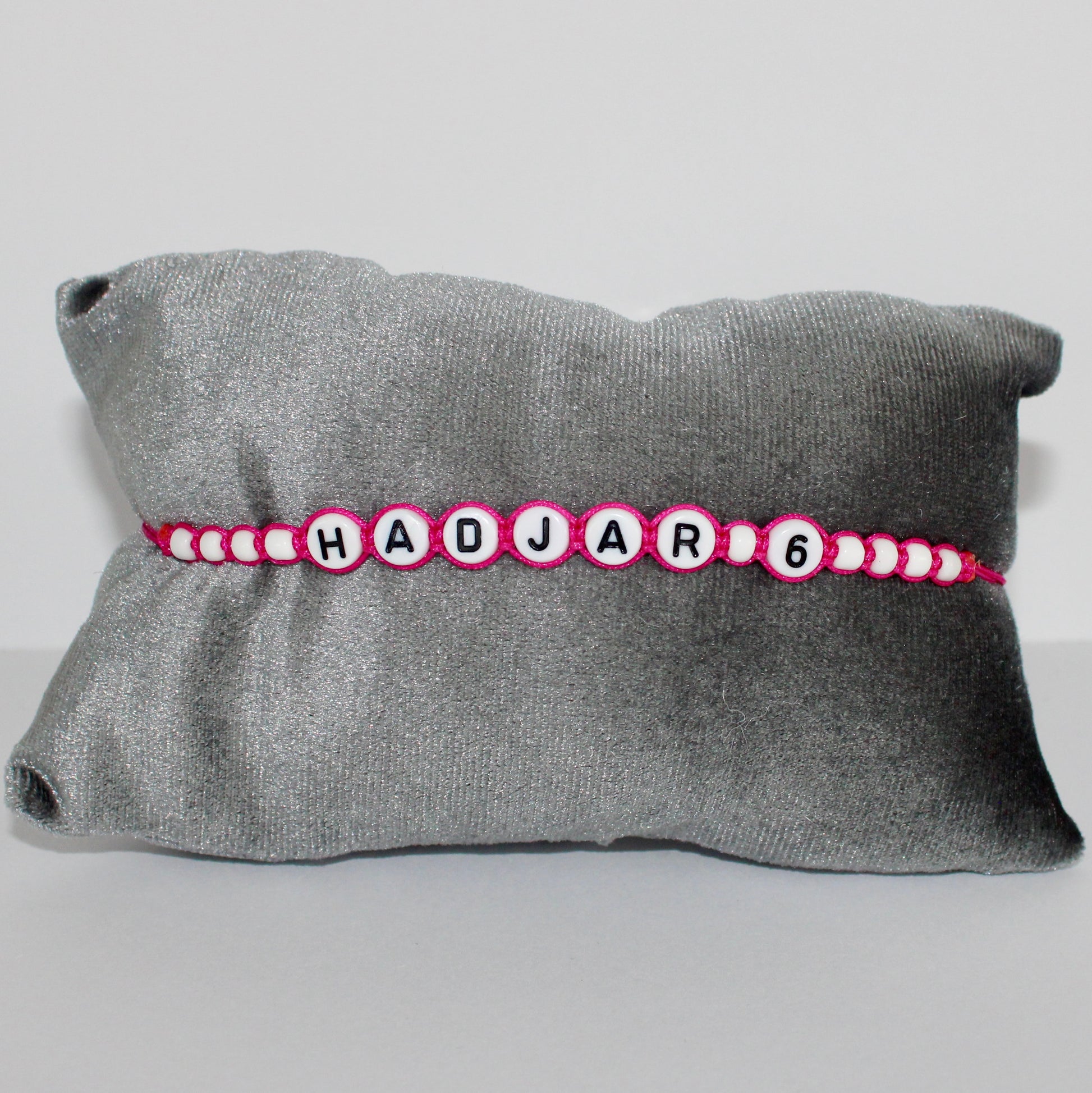 The Hadjar 6 Bracelet is a bracelet with dark pink cord, white beads and white with black letters/numbers. The bracelet is adjustable and easy to put on yourself.