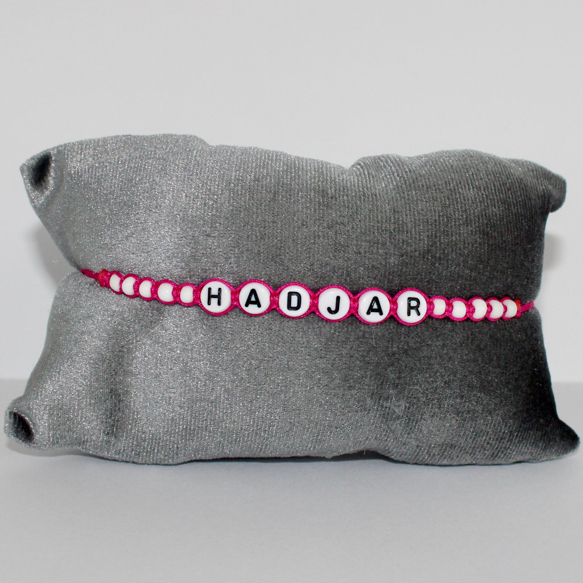 The Hadjar Bracelet is a bracelet with dark pink cord, white beads and white with black letters/numbers. The bracelet is adjustable and easy to put on yourself.