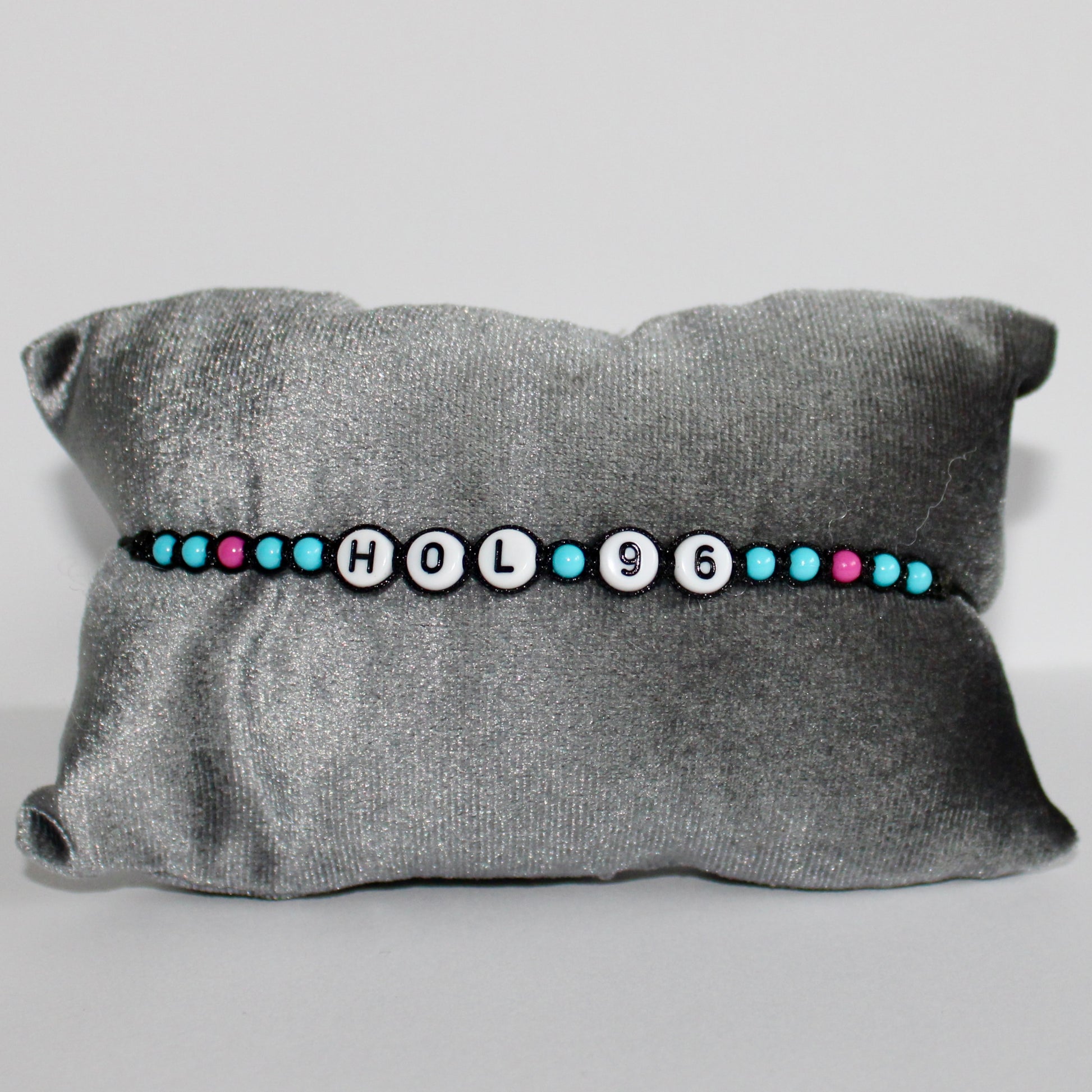The Hol 96 Bracelet is a bracelet with black cord, light blue and pink beads and white with black letters/numbers. The bracelet is adjustable and easy to put on by yourself.