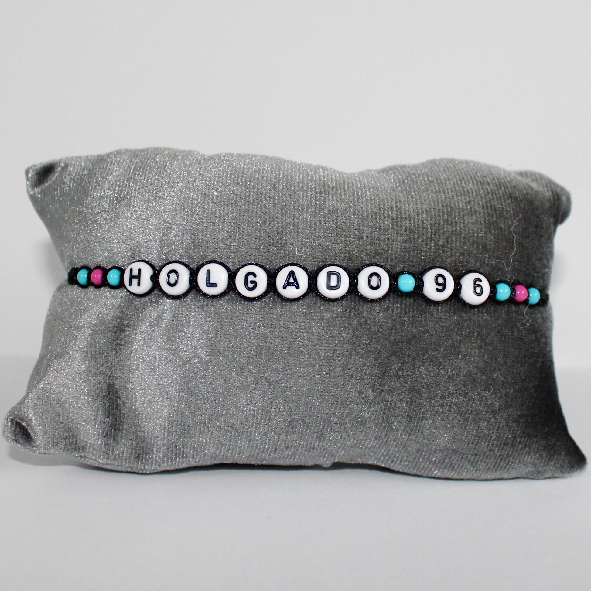 The Holgado 96 Bracelet is a bracelet with black cord, light blue and pink beads and white with black letters/numbers. The bracelet is adjustable and easy to put on by yourself.