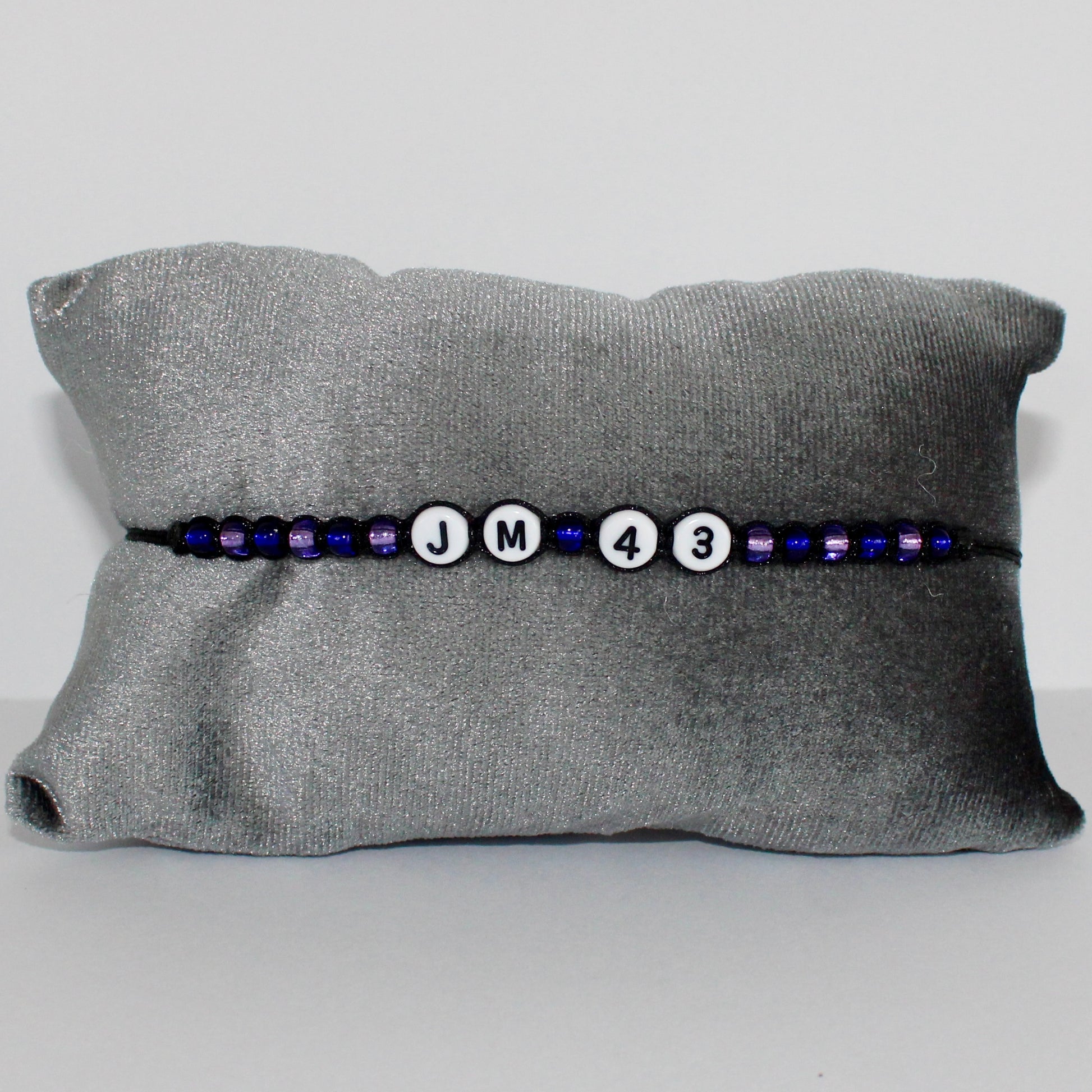 The Jack Miller 43 Bracelet is a bracelet with black cord, glass royal blue and purple beads and white with black letters/numbers. The bracelet is adjustable and easy to put on by yourself.
