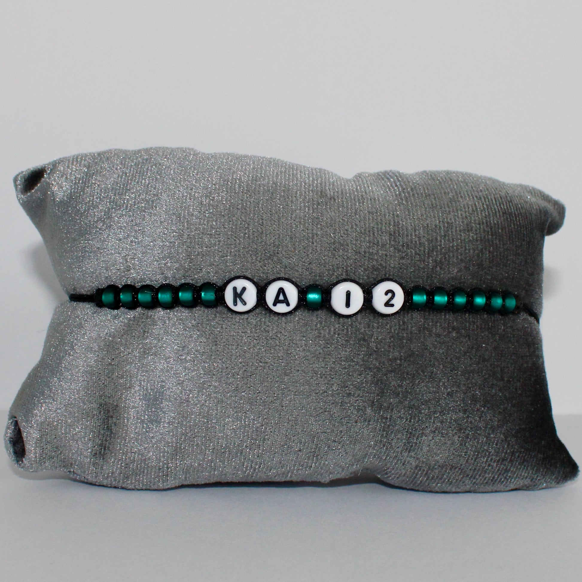 The Kimi Antonelli 12 Bracelet is a bracelet with black cord, glass matt turquoise beads with silver inner lining and white with black letters/numbers. The bracelet is adjustable and easy to put on by yourself.
