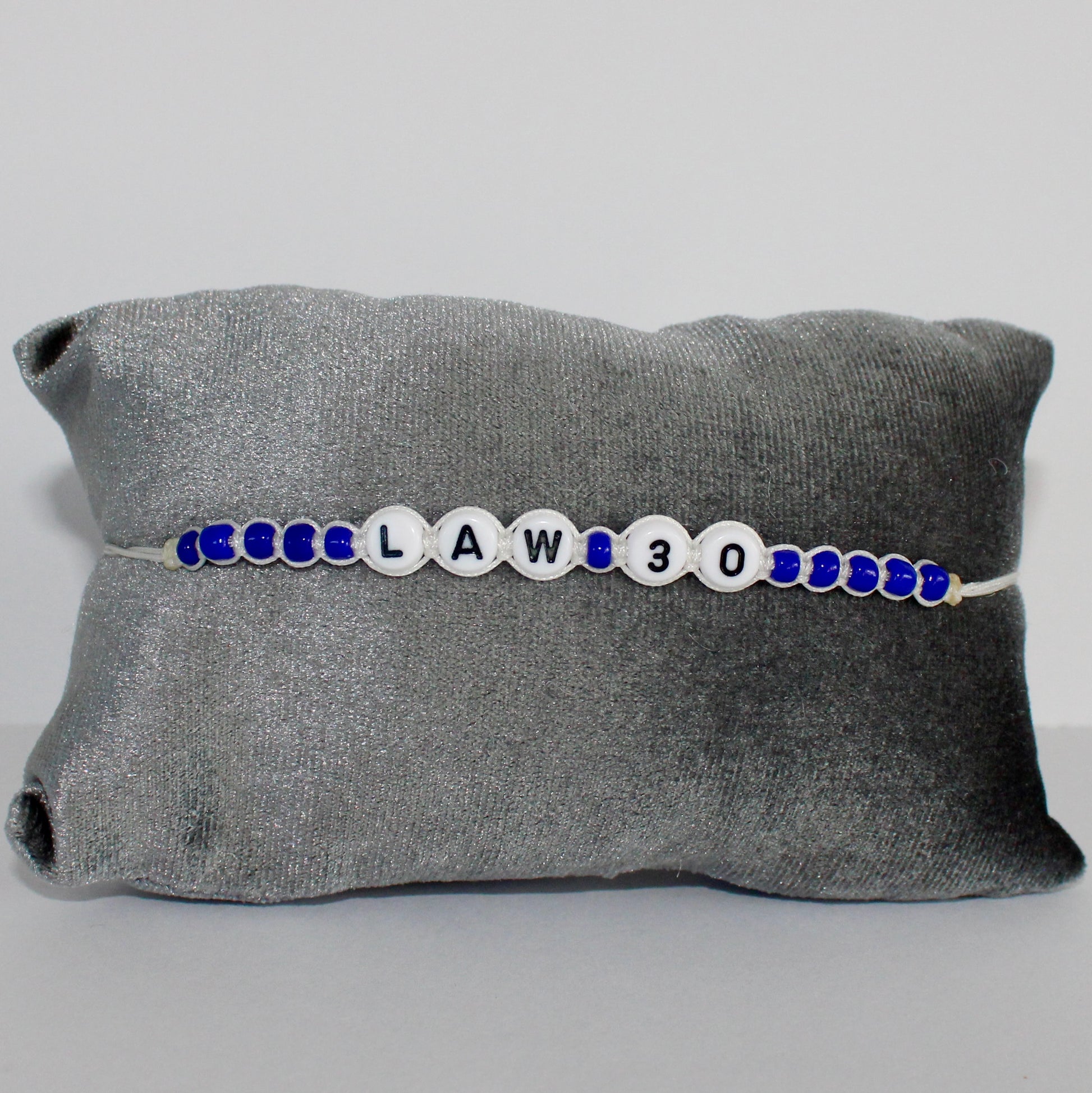 The Law 30 Bracelet is a bracelet with white cord, blue beads and white with black letters. The bracelet is adjustable and easy to put on by yourself.