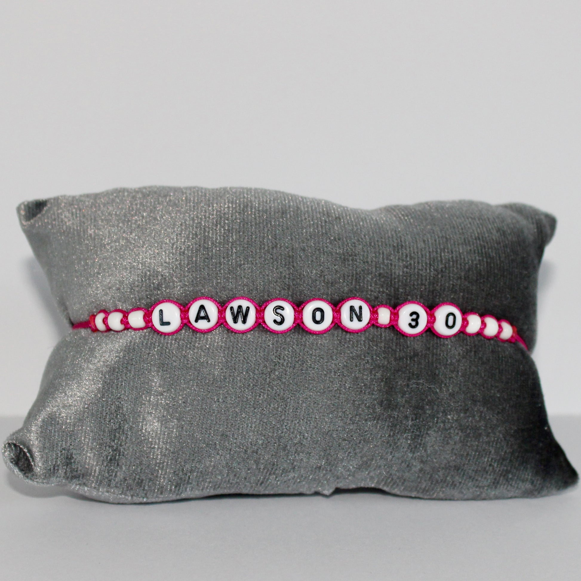 The Lawson 30 Bracelet is a bracelet with dark pink cord, white beads and white with black letters/numbers. The bracelet is adjustable and easy to put on yourself.