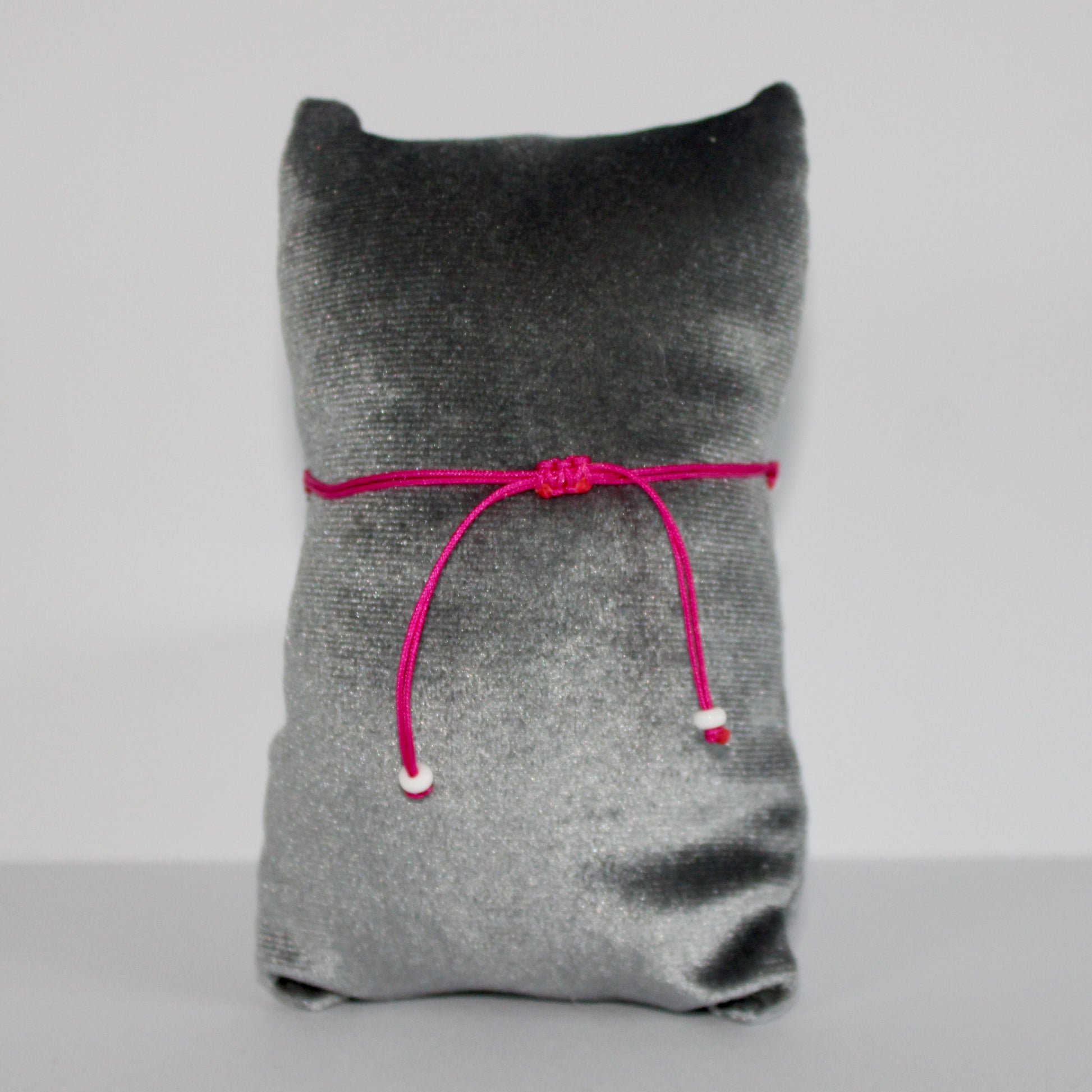 The Law 30 Bracelet is a bracelet with dark pink cord, white beads and white with black letters/numbers. The bracelet is adjustable and easy to put on yourself.