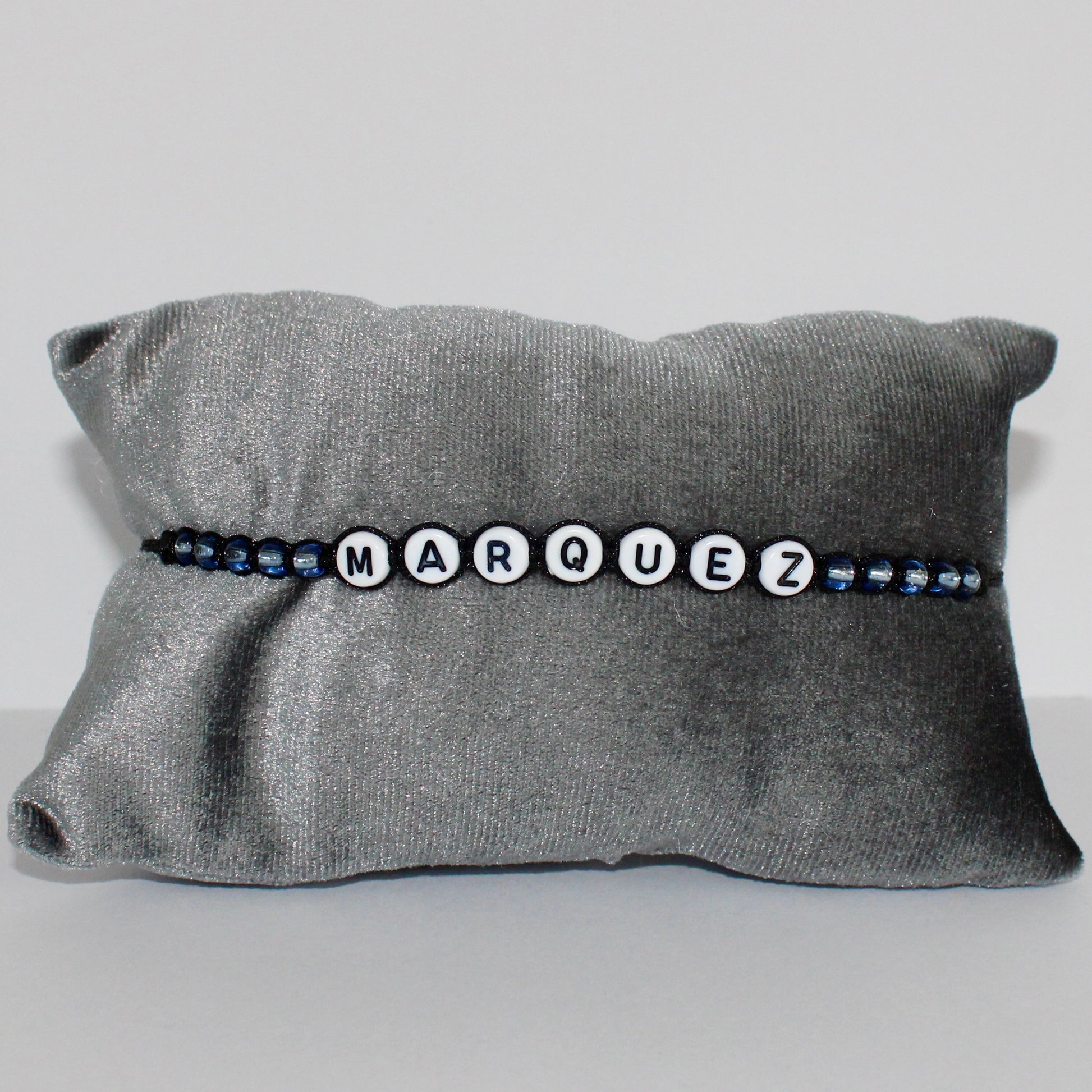 The Marquez Bracelet is a bracelet with black cord, blue/grey glass beads and white with black letters/numbers. The bracelet is adjustable and easy to put on by yourself.