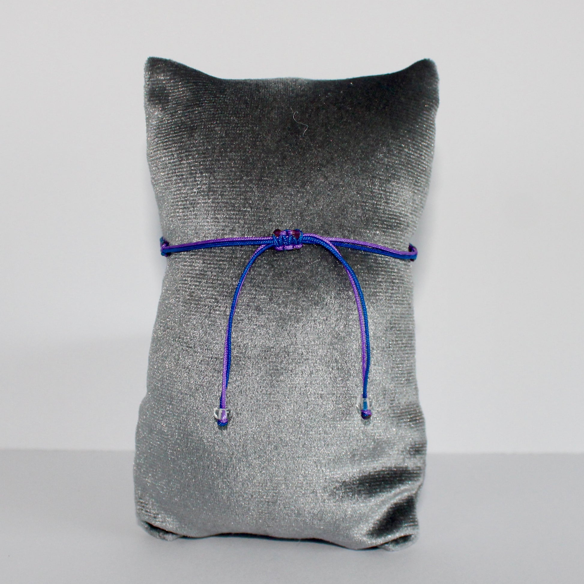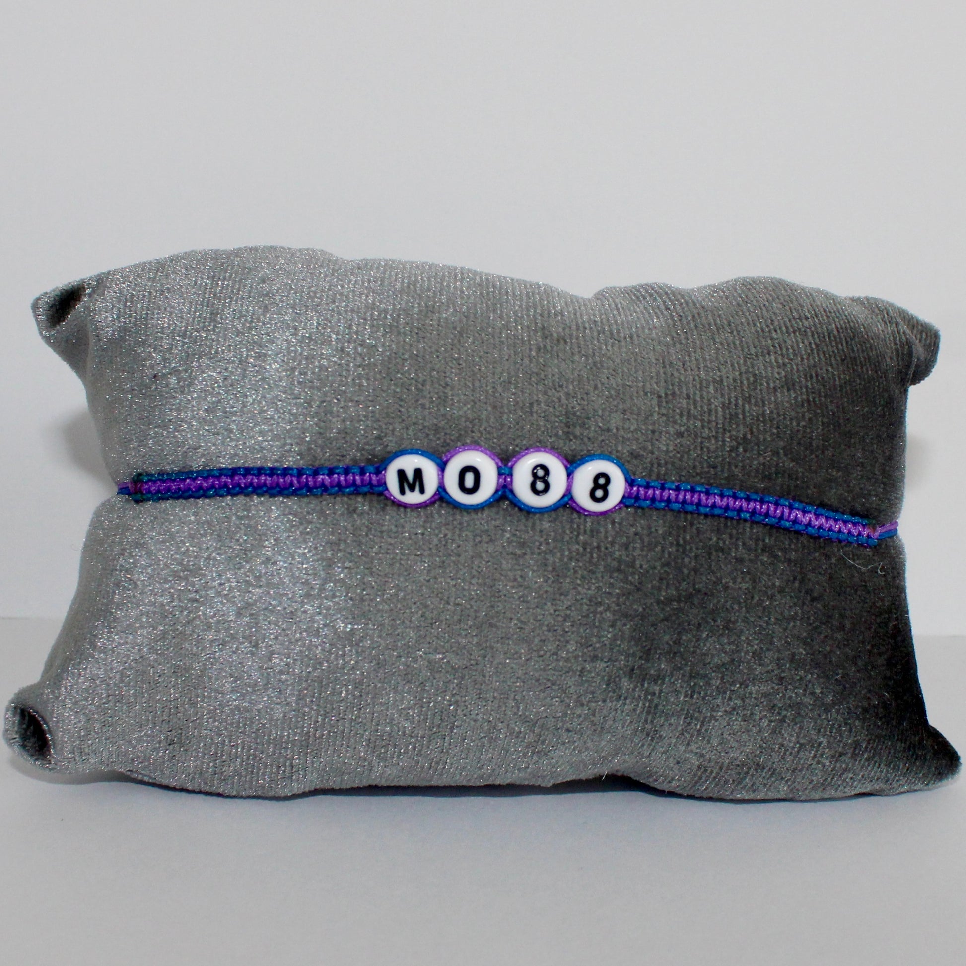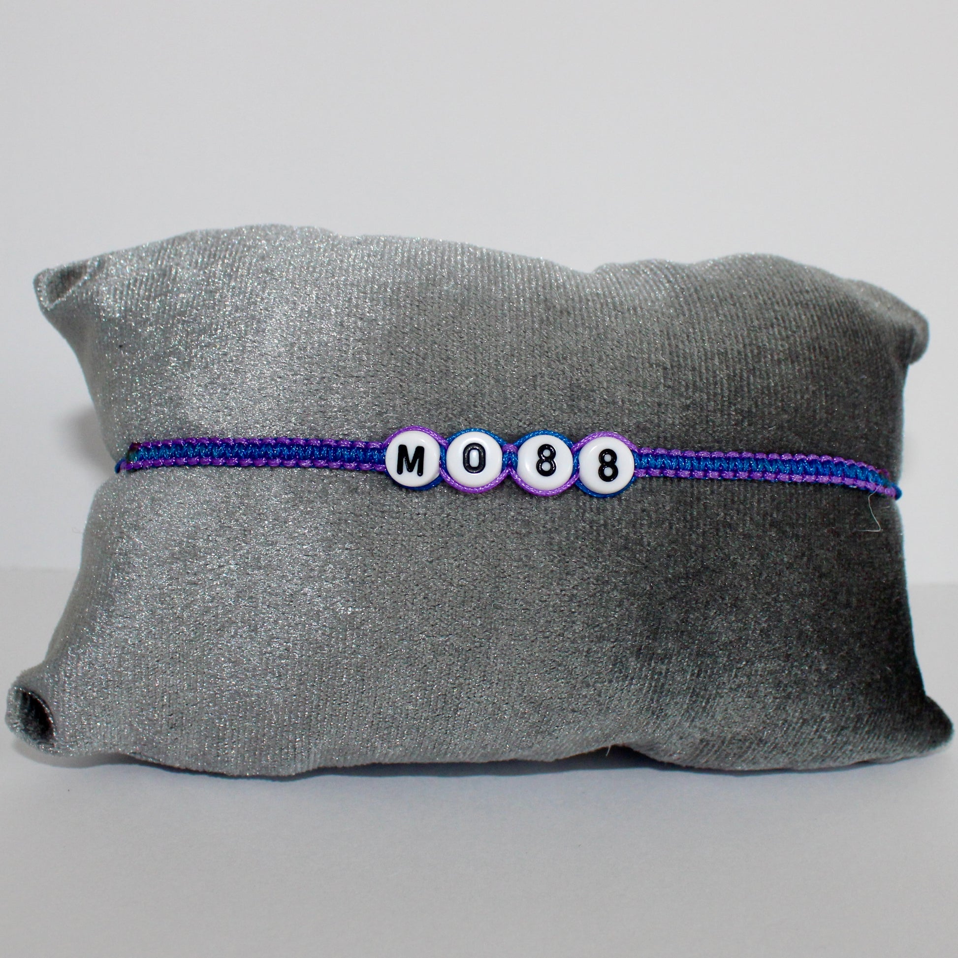 The Miguel Oliveira 88 Bracelet is a bracelet with royal blue and purple cord and white with black letters/numbers. The bracelet is adjustable and easy to put on by yourself.