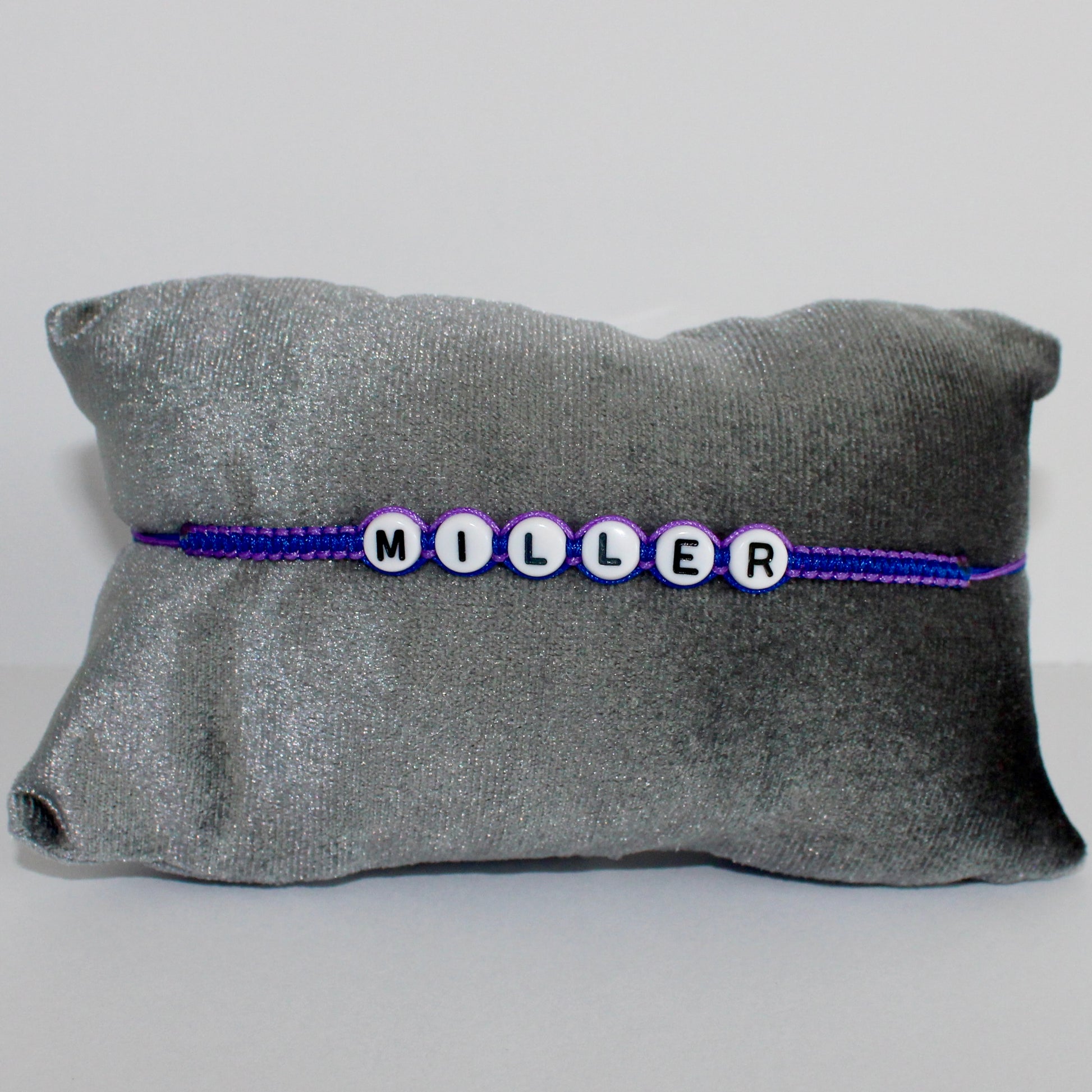 The Miller Bracelet is a bracelet with royal blue and purple cord and white with black letters/numbers. The bracelet is adjustable and easy to put on by yourself.