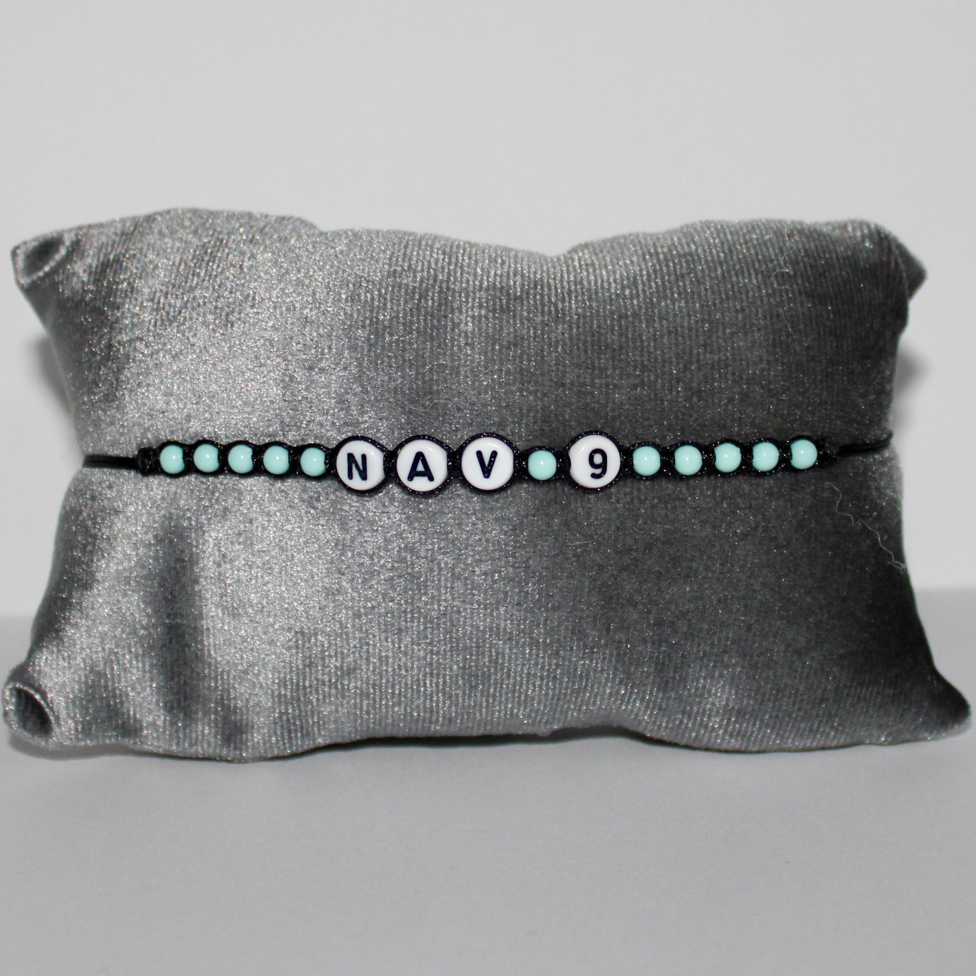 The Nav 9 Bracelet is a bracelet with black cord, mint green beads and white with black letters/numbers. The bracelet is adjustable and easy to put on by yourself.