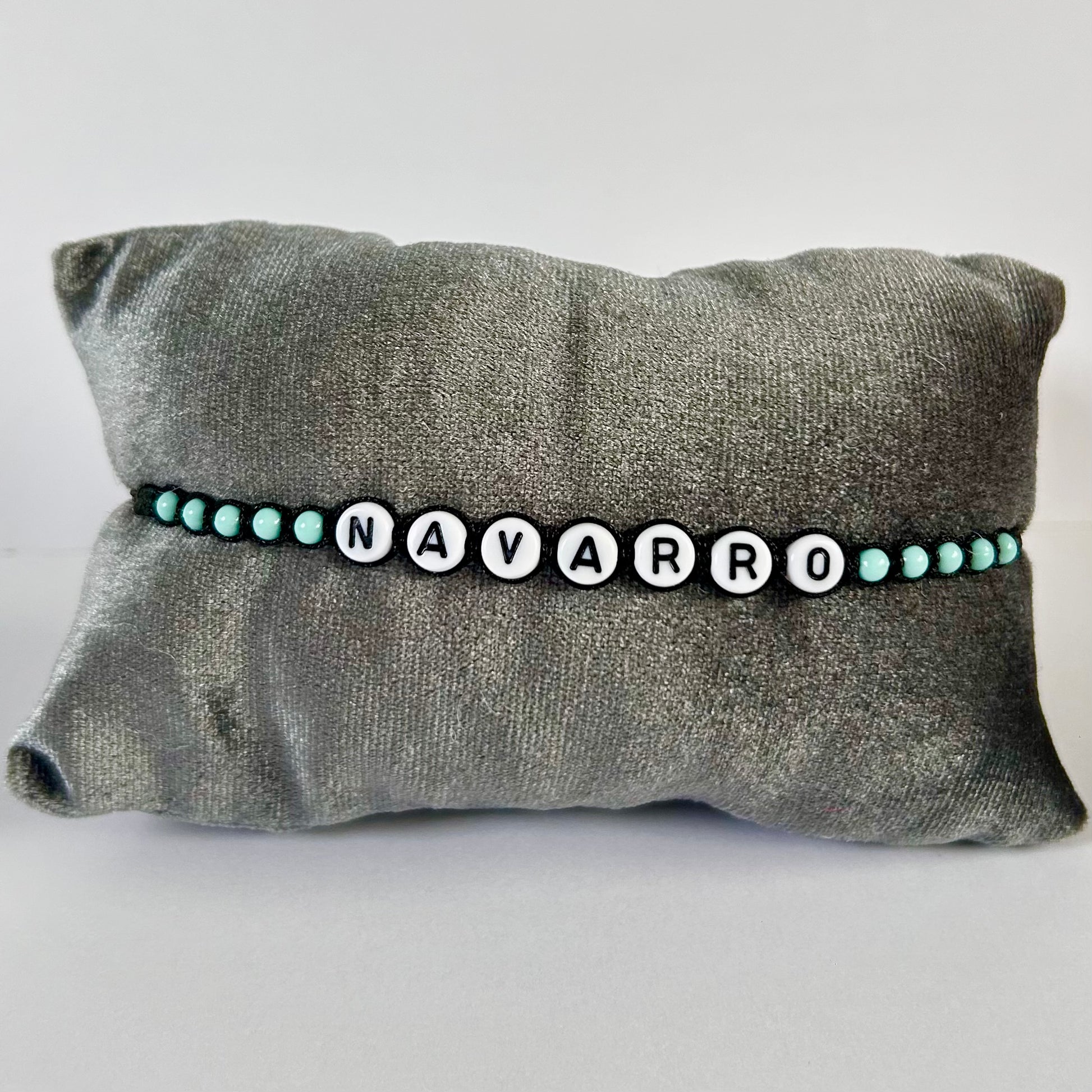 The Navarro Bracelet is a bracelet with black cord, mint green beads and white with black letters/numbers. The bracelet is adjustable and easy to put on by yourself.