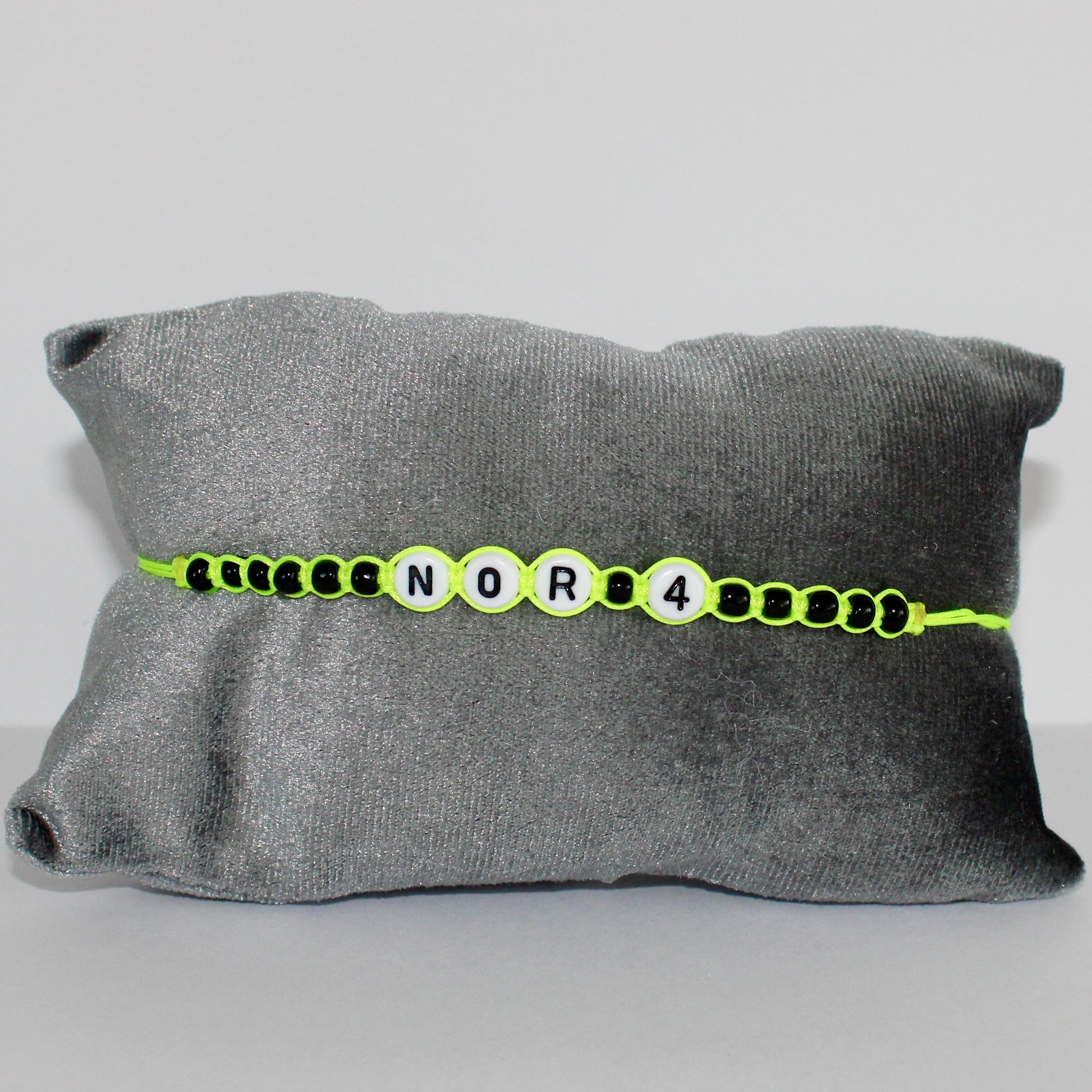The Nor 4 Bracelet is a bracelet with neon yellow cord, black beads and white with black letters/numbers. The bracelet is adjustable and easy to put on by yourself.