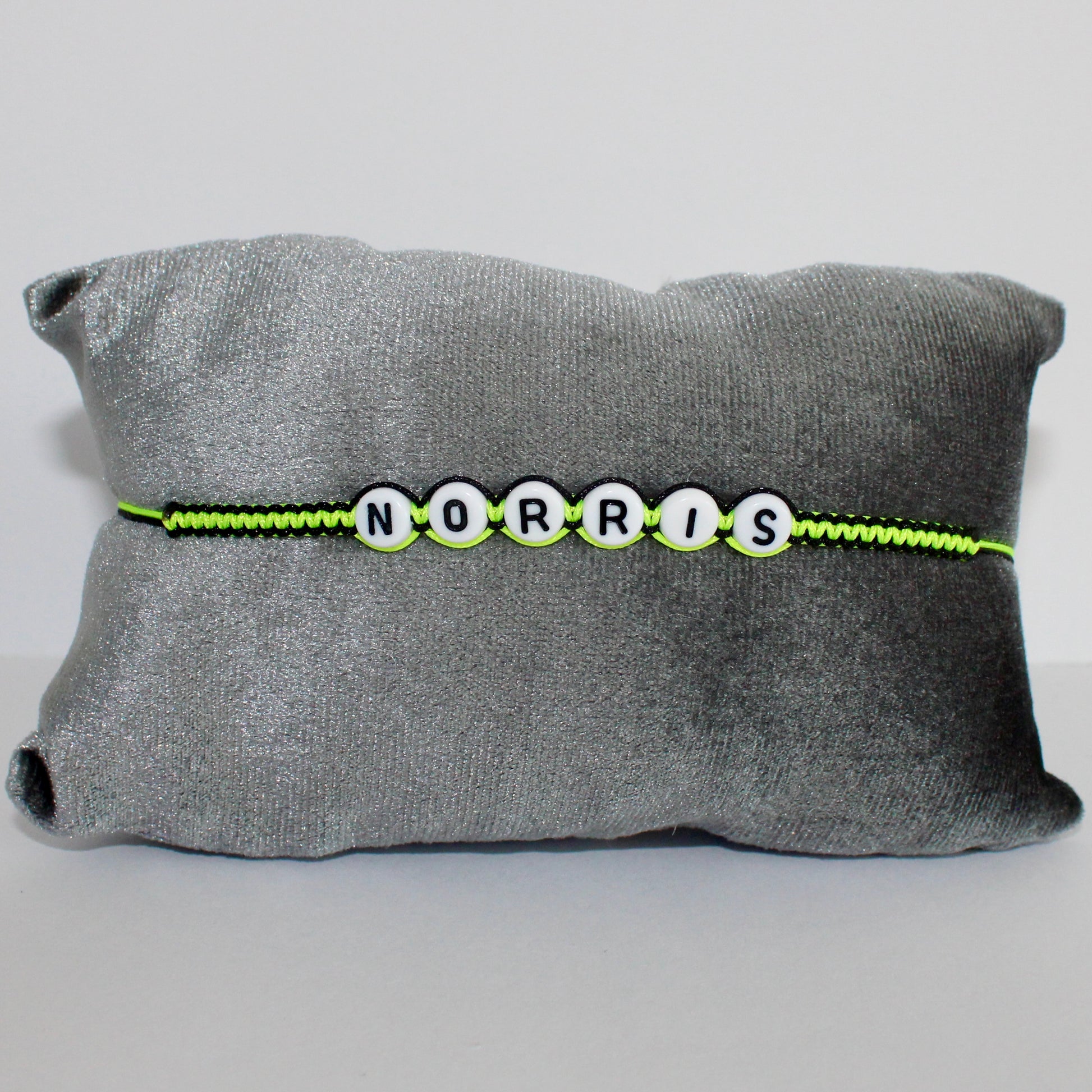 The Norris Bracelet is a bracelet with black and neon yellow cord and white with black letters/numbers. The bracelet is adjustable and easy to put on by yourself.