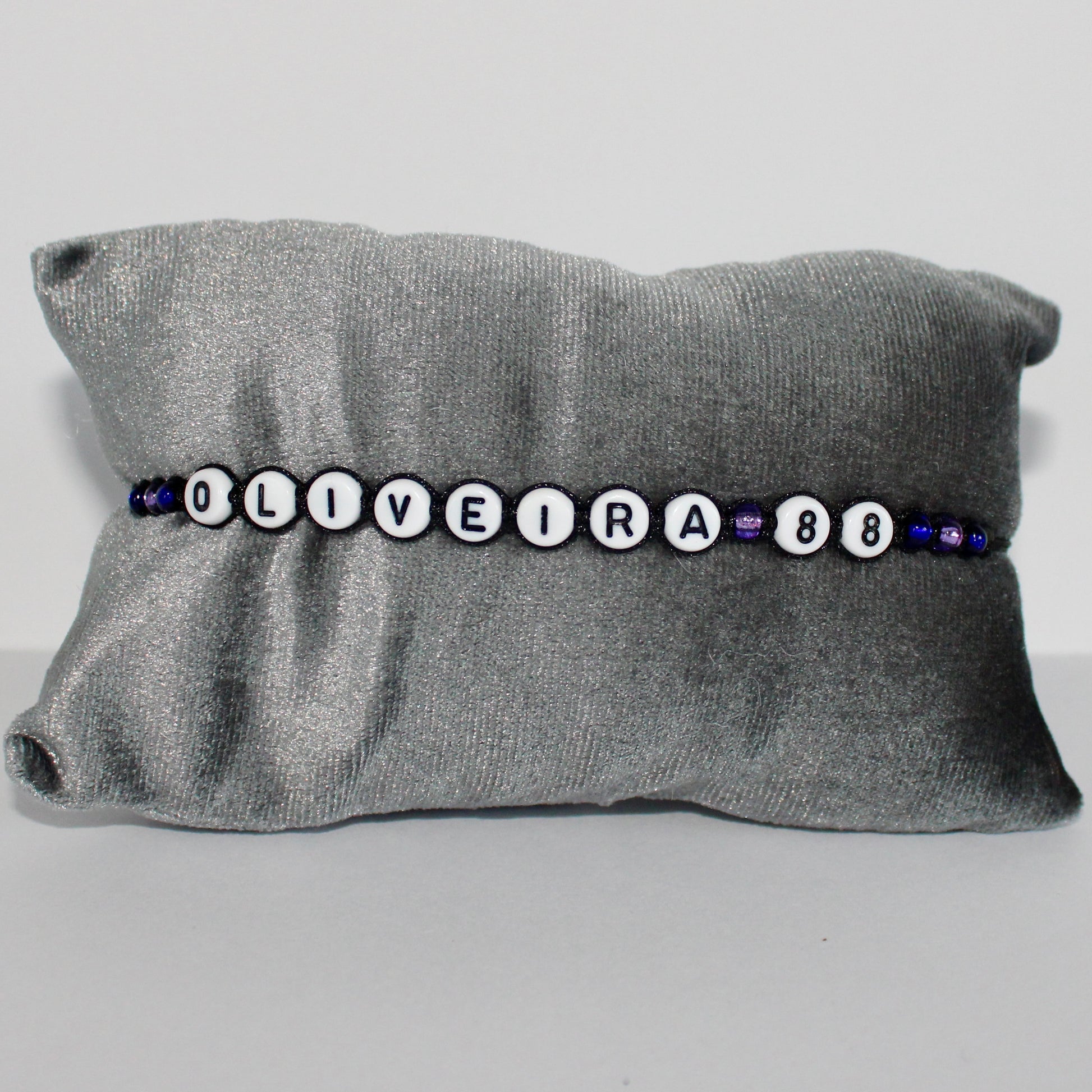 The Oliveira 88 Bracelet is a bracelet with black cord, glass royal blue and purple beads and white with black letters/numbers. The bracelet is adjustable and easy to put on by yourself.