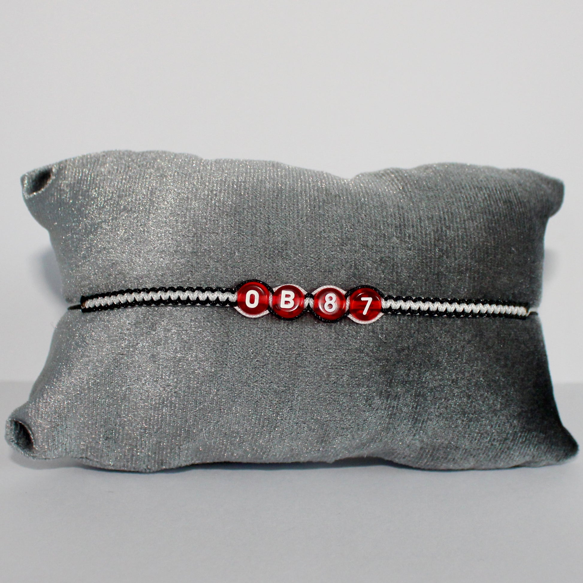 The Ollie Bearman 87 Bracelet is a bracelet with white and back cord and red with white letters/numbers. The bracelet is adjustable and easy to put on by yourself.