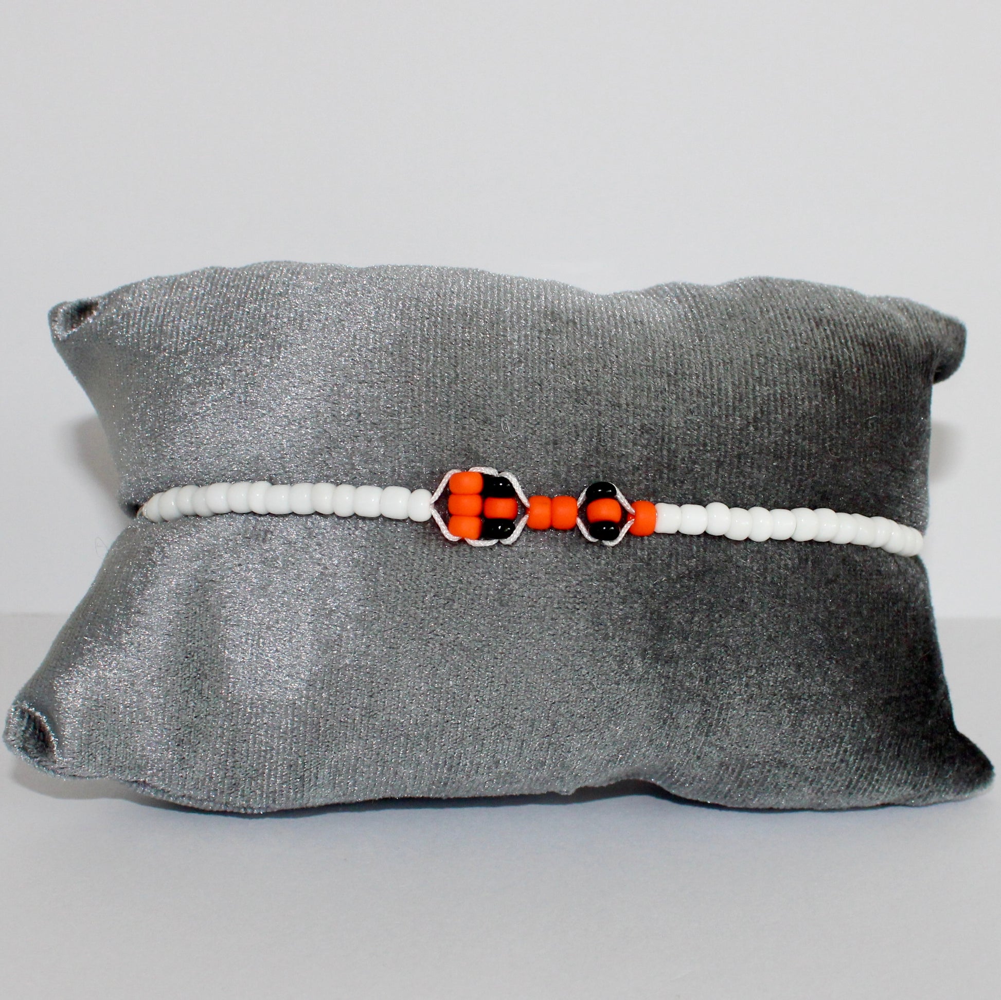 The orange F1 Car Bracelet is a bracelet with white cord, white beads and matt orange car. The bracelet is adjustable and easy to put on by yourself.