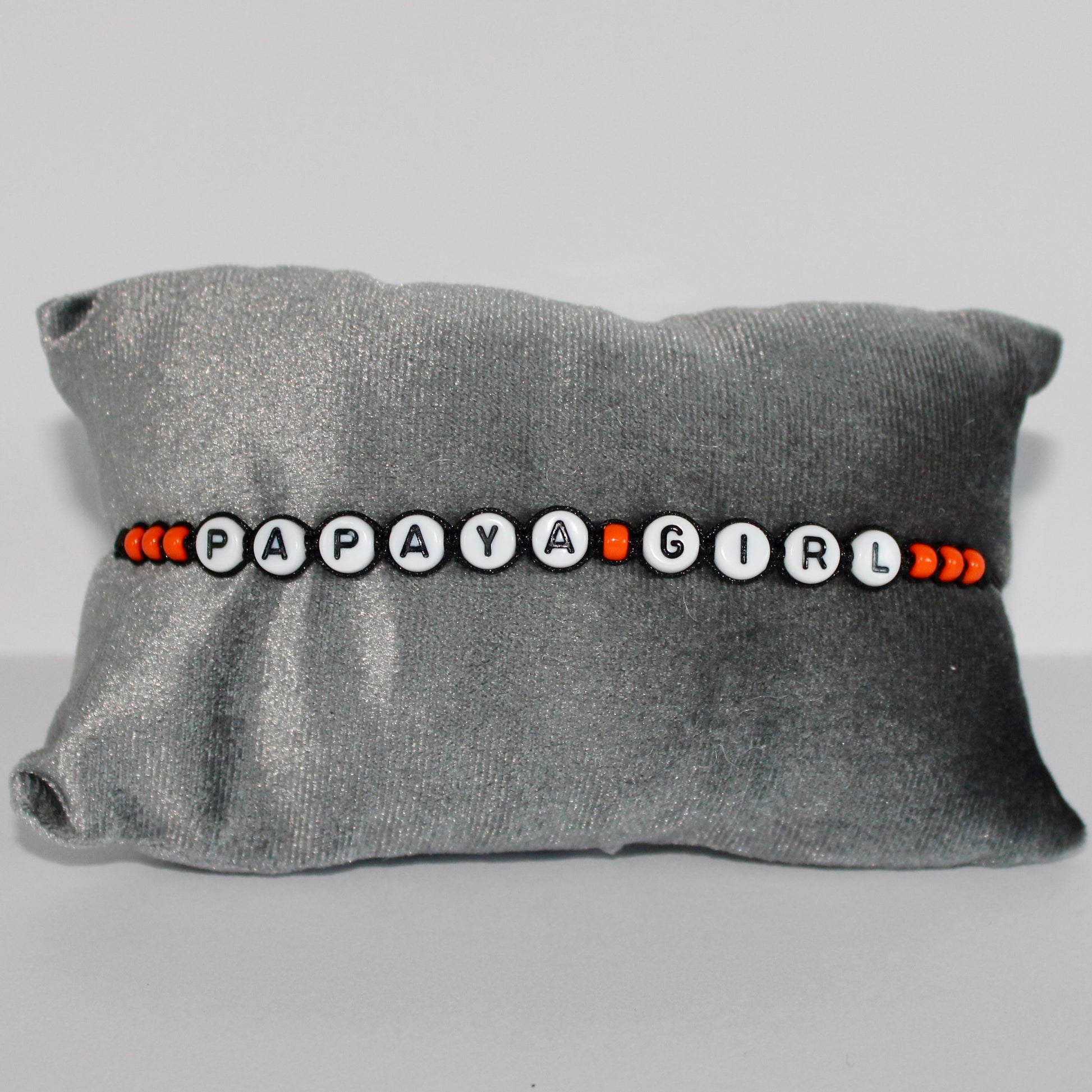 The Papaya Girl Bracelet is a bracelet with black cord, orange beads and white with black letters. The bracelet is adjustable and easy to put on by yourself.