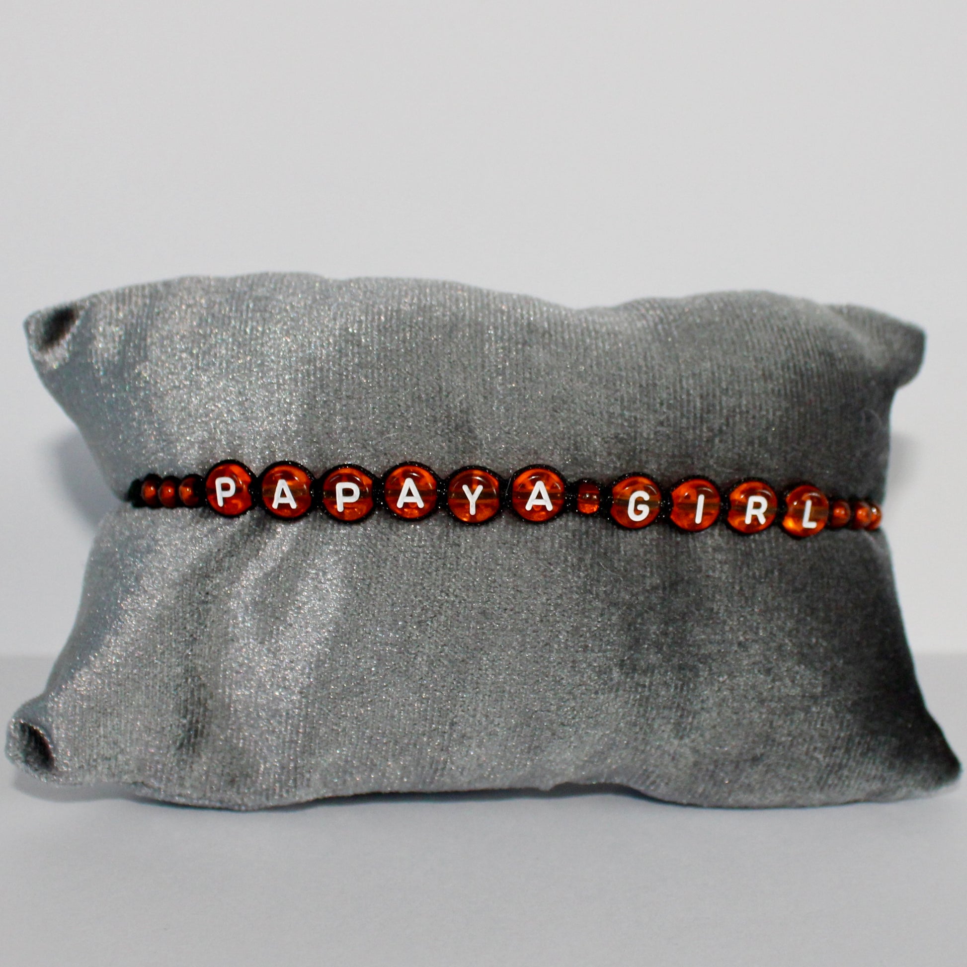 The Papaya Girl Bracelet is a bracelet with black cord, orange glass beads and orange with white letters. The bracelet is adjustable and easy to put on by yourself.