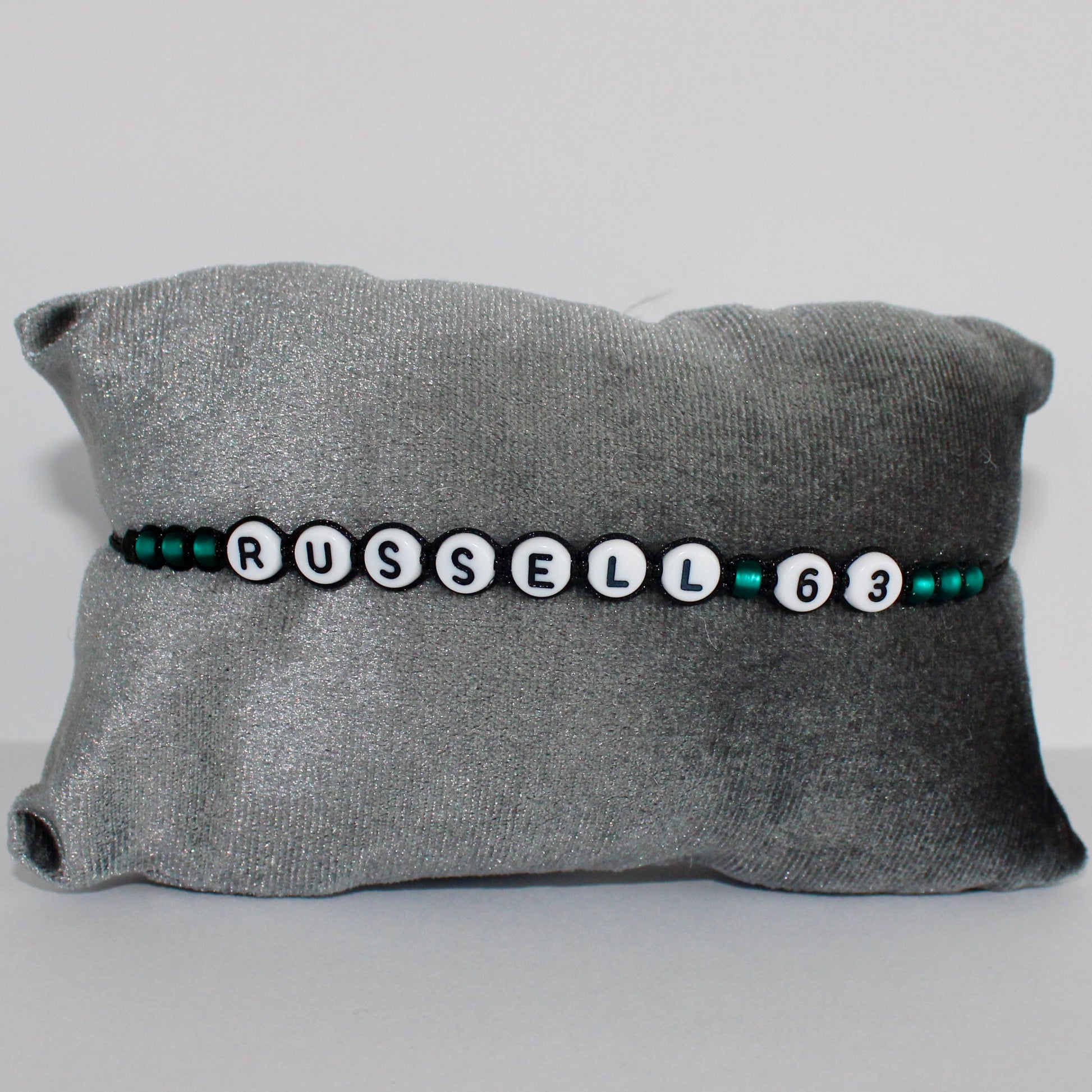 The Russell 63 Bracelet is a bracelet with black cord, glass matt turquoise beads with silver inner lining and white with black letters/numbers. The bracelet is adjustable and easy to put on by yourself.