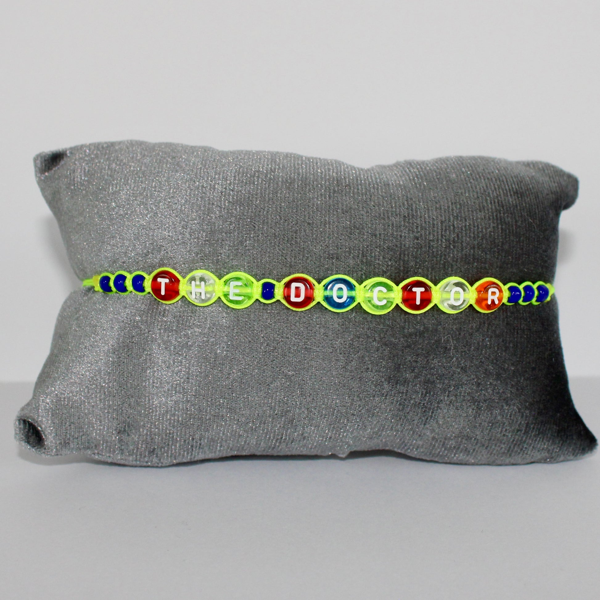 The The Doctor Bracelet is a bracelet with neon yellow cord, royal blue beads and different colour letters. The bracelet is adjustable and easy to put on by yourself.