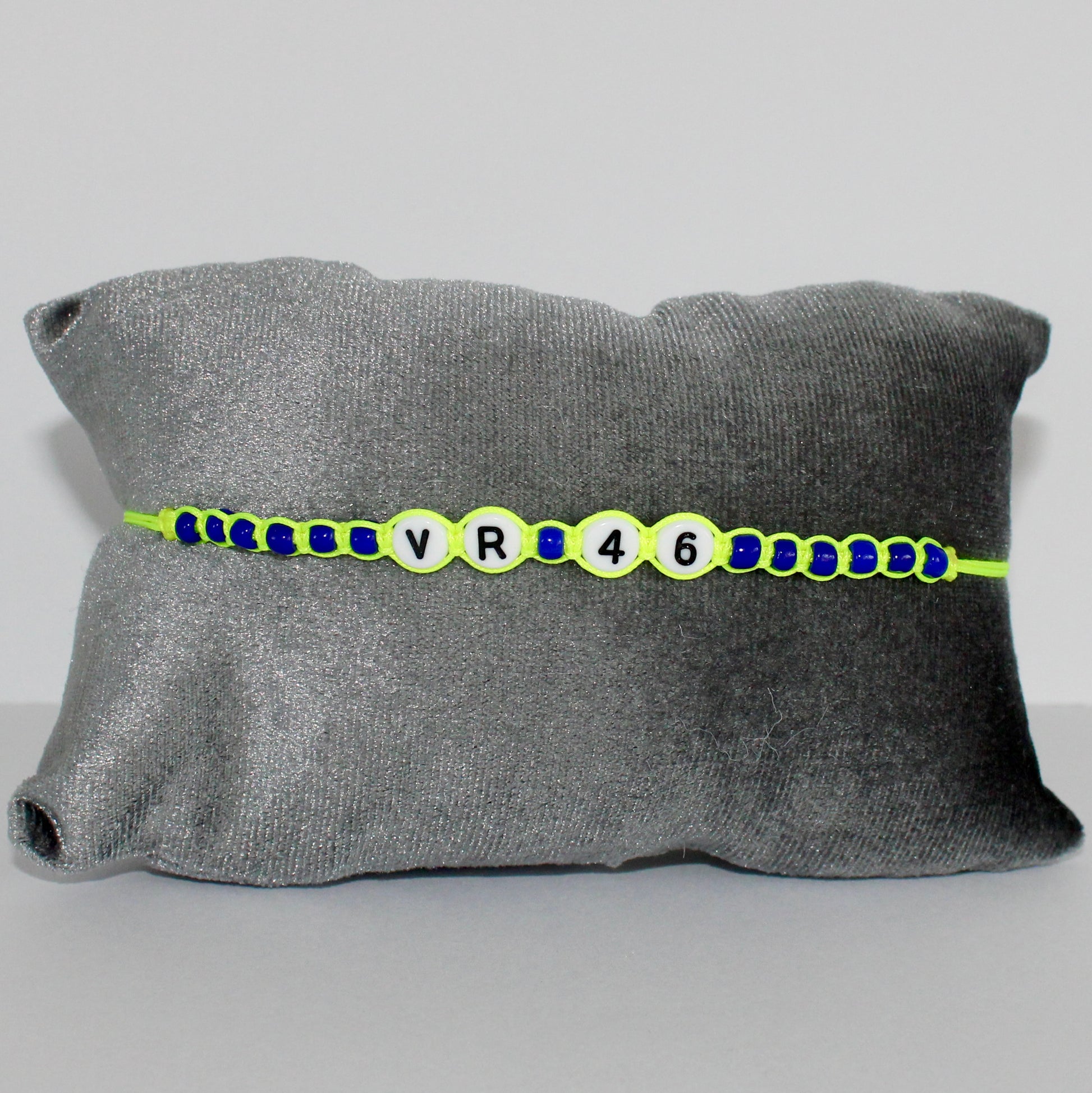 The Valentino Rossi 46 is a bracelet with neon yellow cord, royal blue beads and white with black letters. The bracelet is adjustable and easy to put on by yourself.
