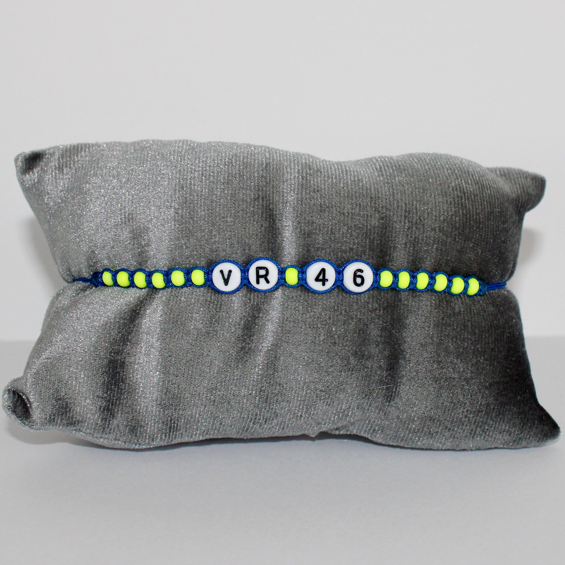 The Valentino Rossi 46 is a bracelet with royal blue cord, neon yellow beads and white with black letters. The bracelet is adjustable and easy to put on by yourself.