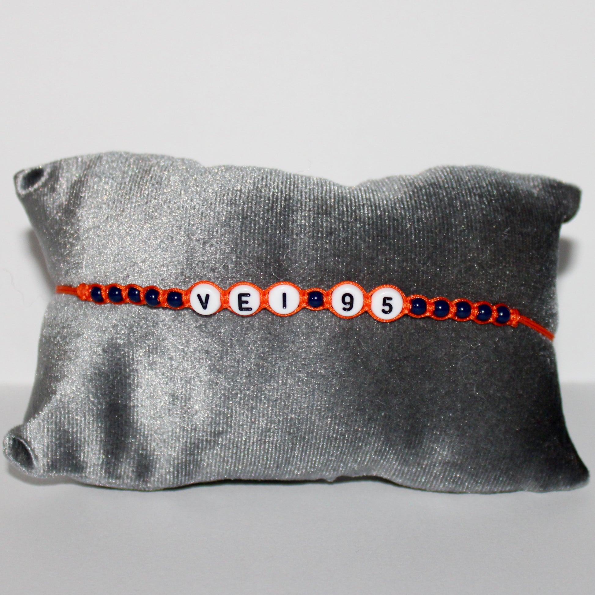 The Vei 95 Bracelet is a bracelet with orange cord, dark blue beads and white with black letters/numbers. The bracelet is adjustable and easy to put on by yourself.