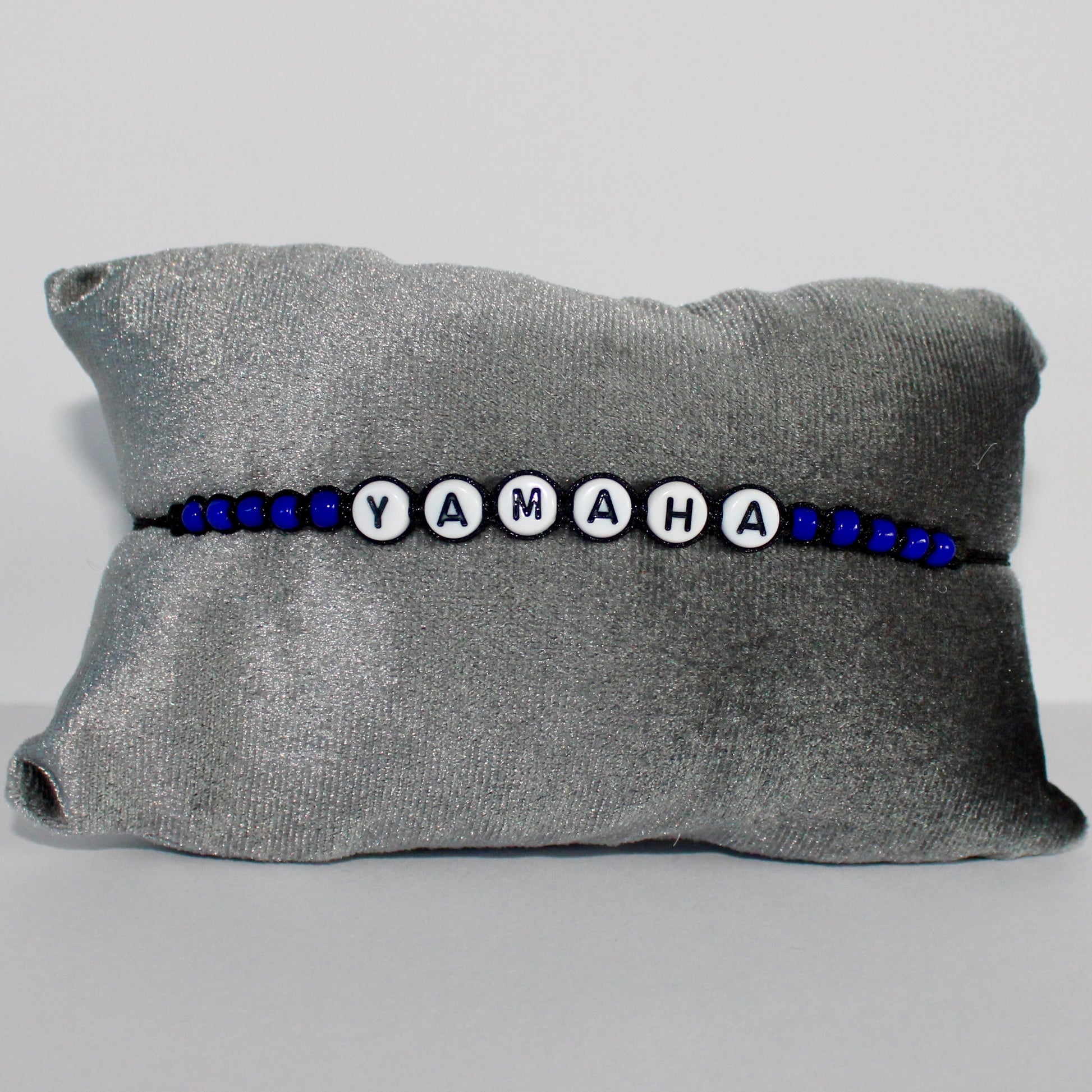 The Yamaha Bracelet is a bracelet with black cord, blue beads and white with black letters/numbers. The bracelet is adjustable and easy to put on by yourself.