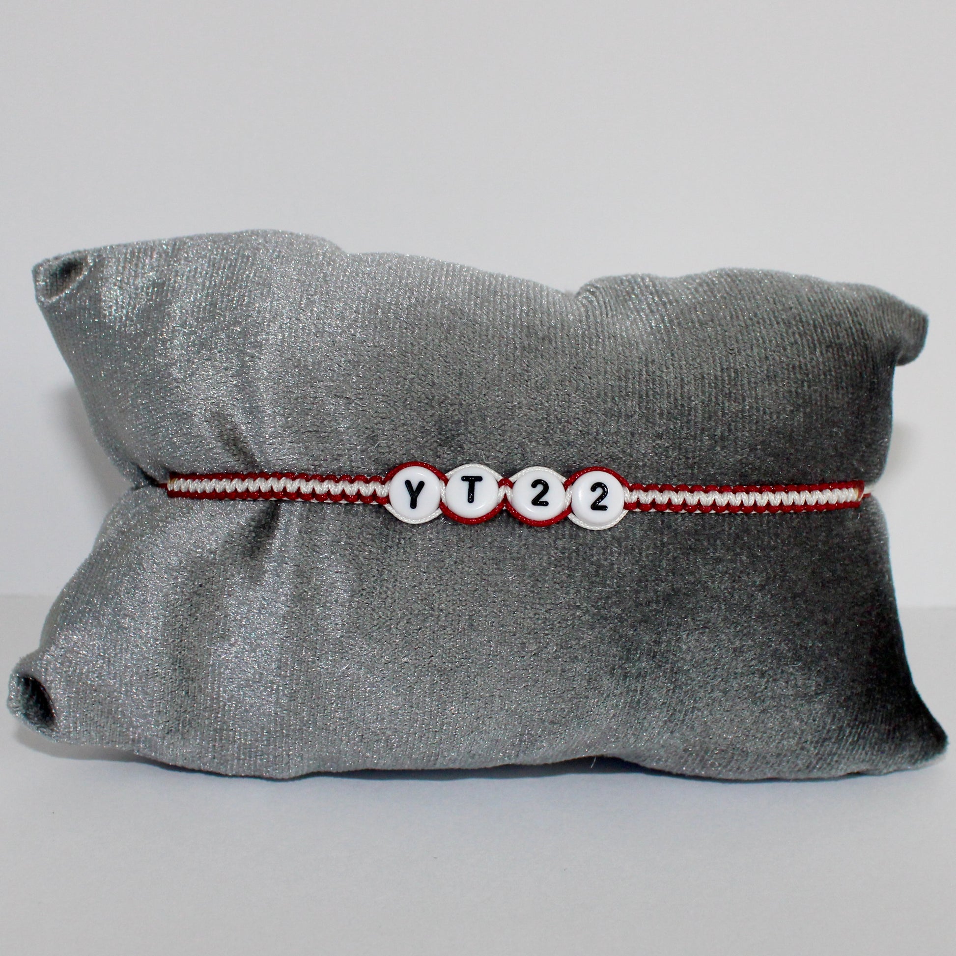 The Yuki Tsunoda 22 Bracelet is a bracelet with dark red and white cord and white with black letters/numbers. The bracelet is adjustable and easy to put on by yourself.